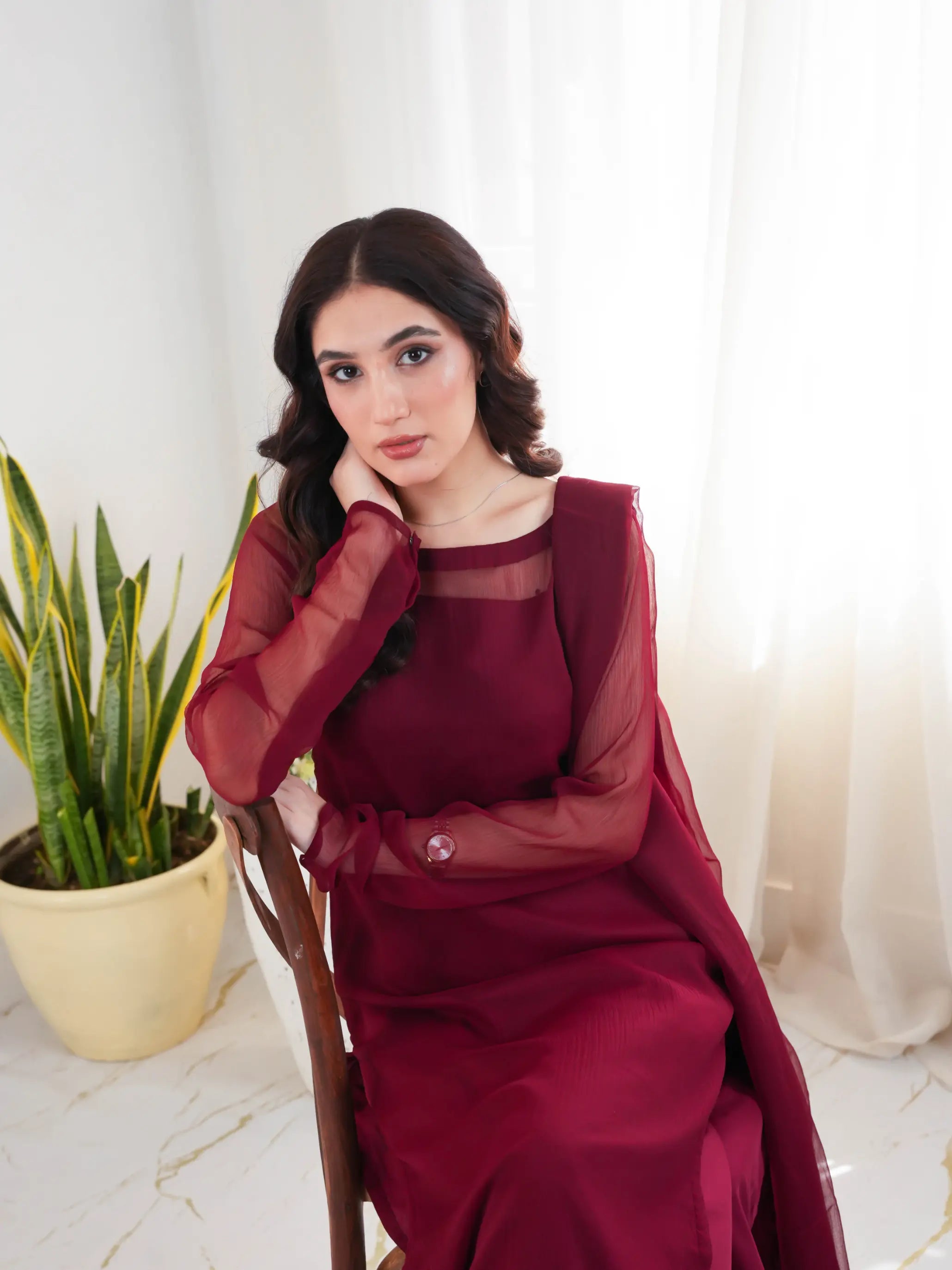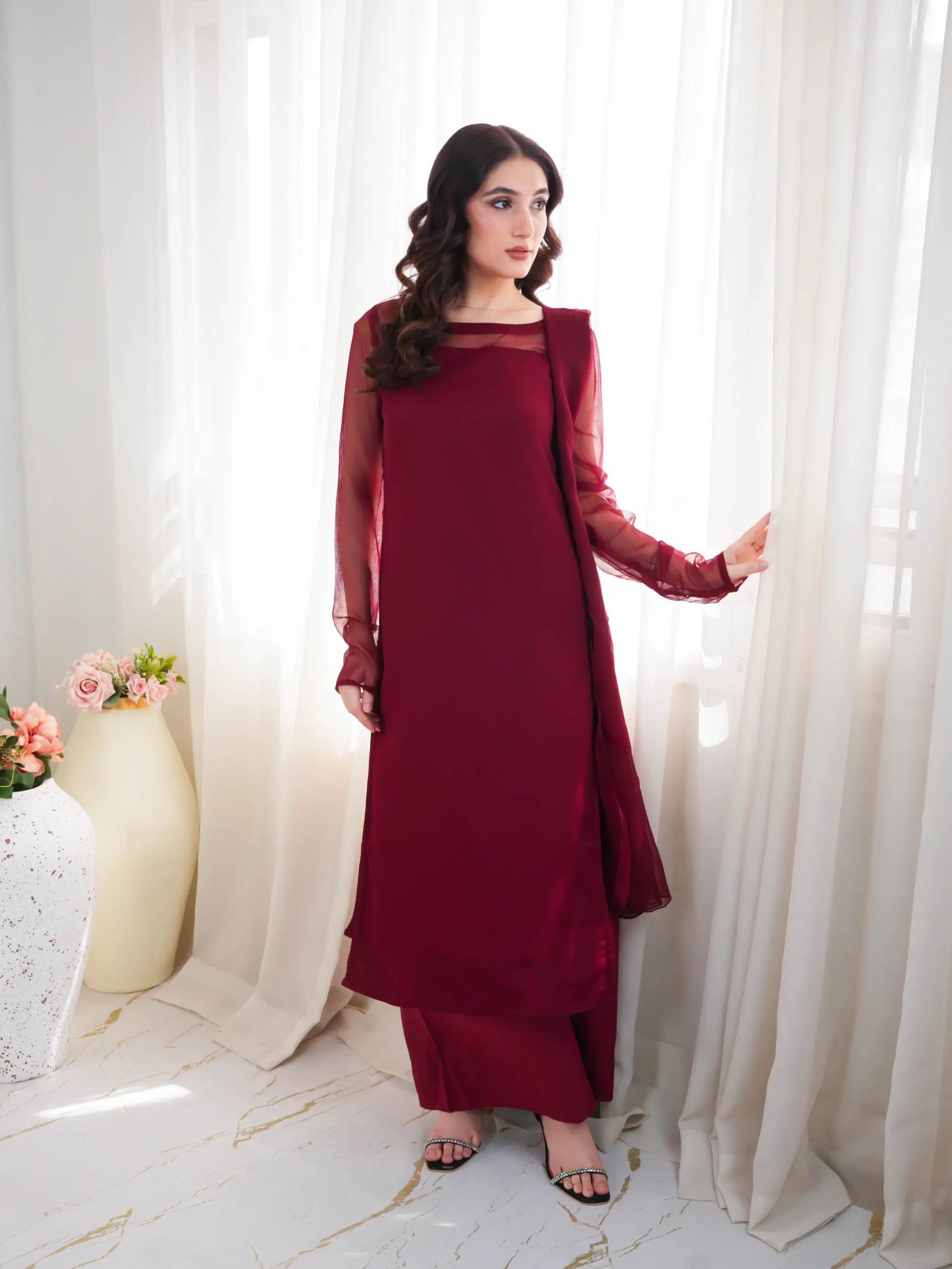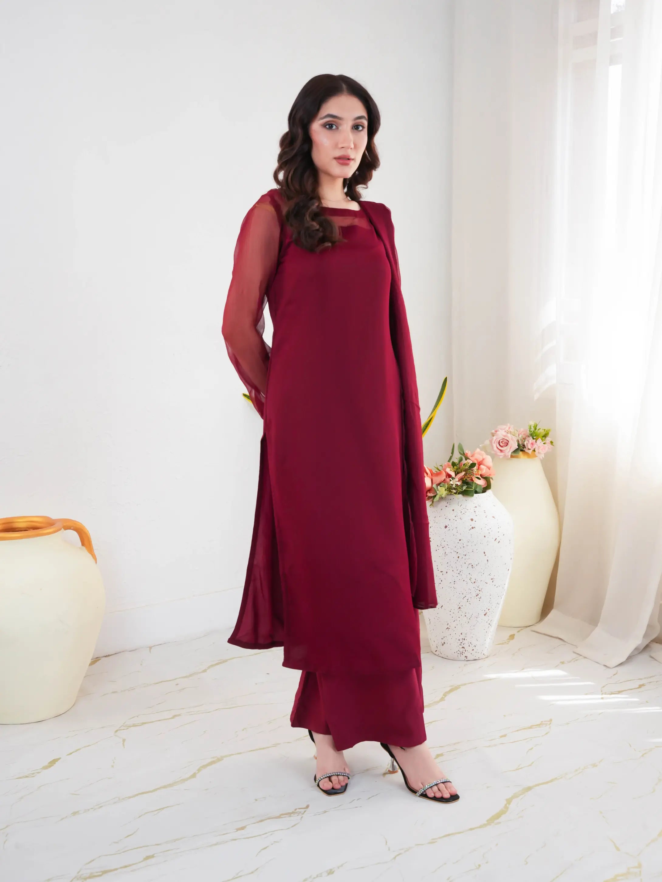 This elegant three-piece suit features a flowy Chiffon shirt and coordinating sheer Chiffon dupatta in a striking burgundy shade. The ensemble is grounded by comfortable, opaque Malayi crepe trousers, creating a sophisticated and luxurious look with beautiful drape and movement.