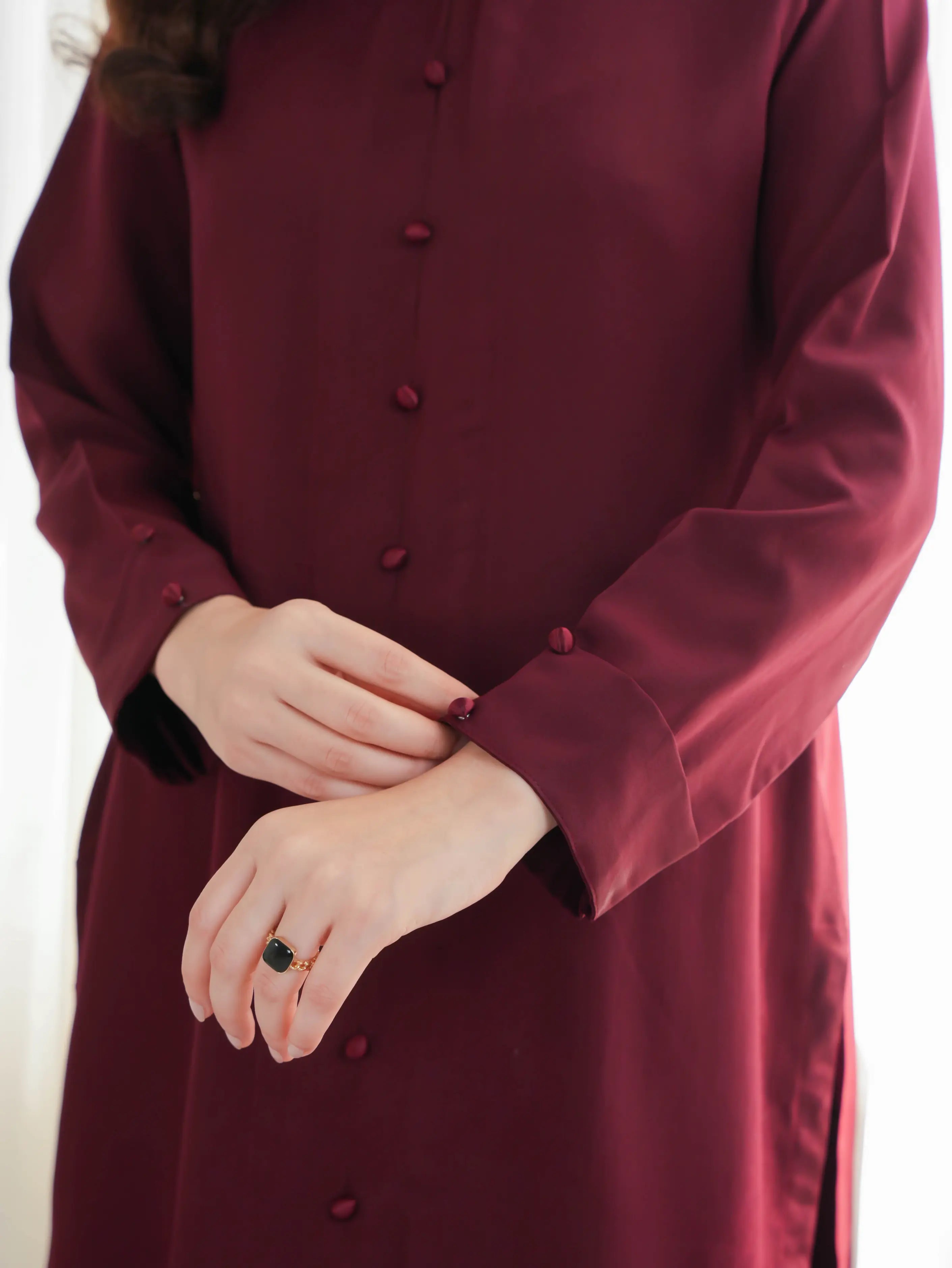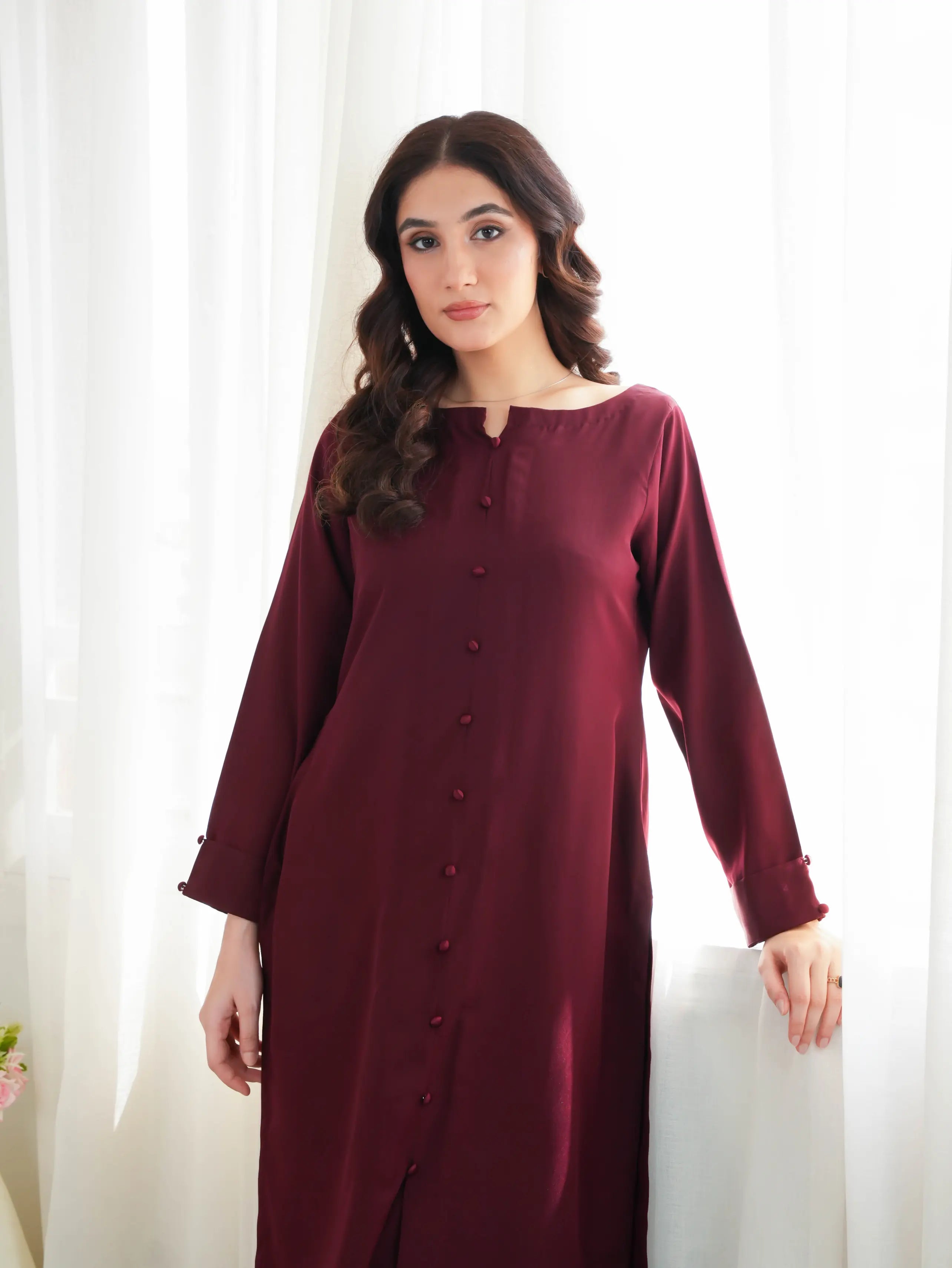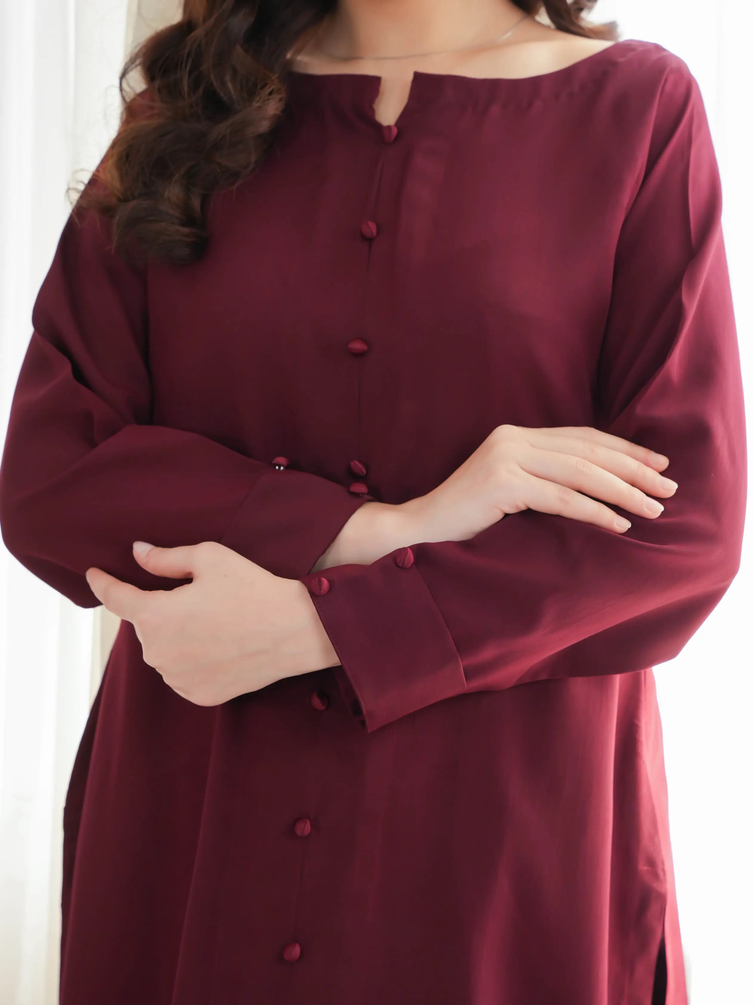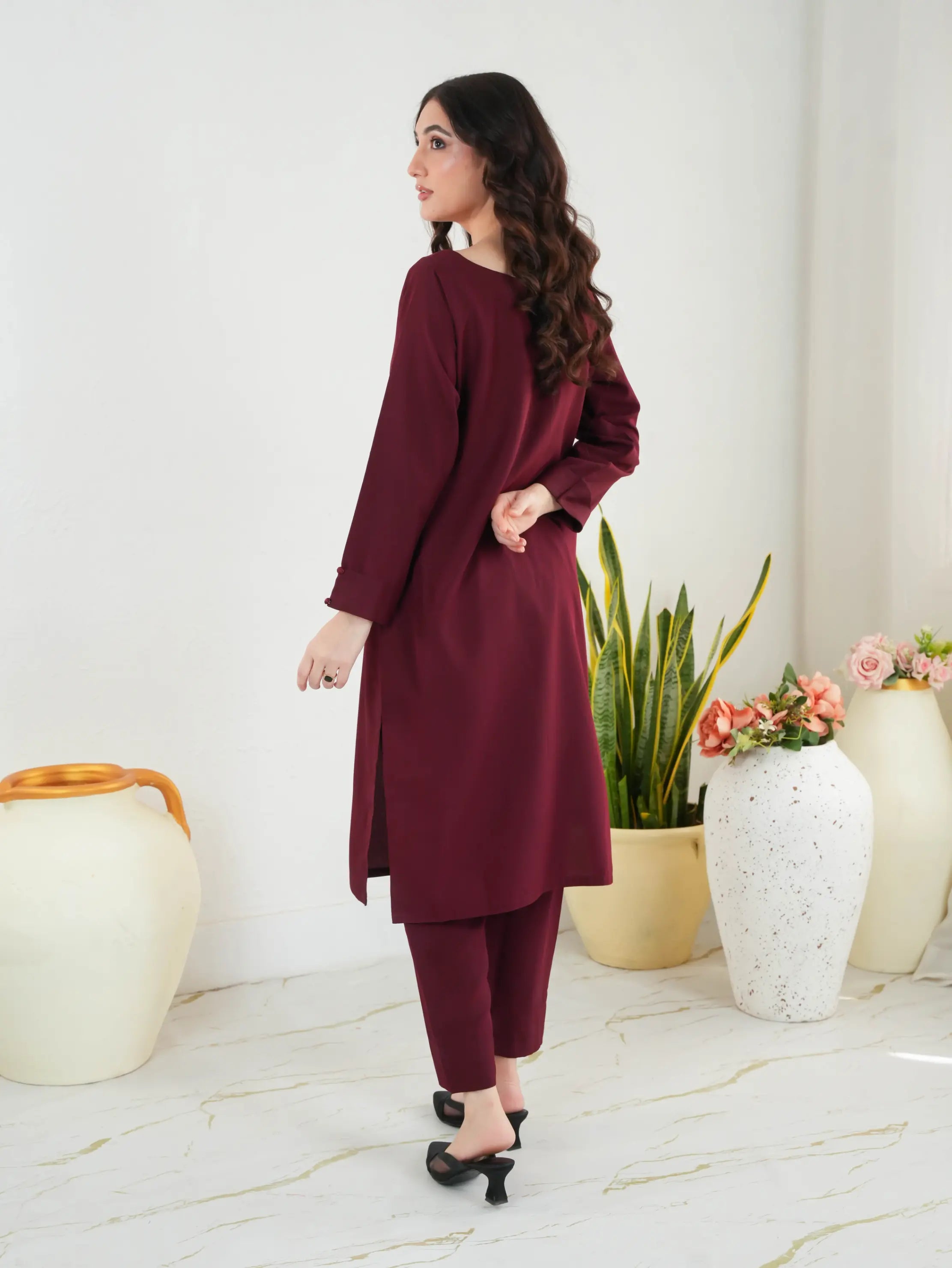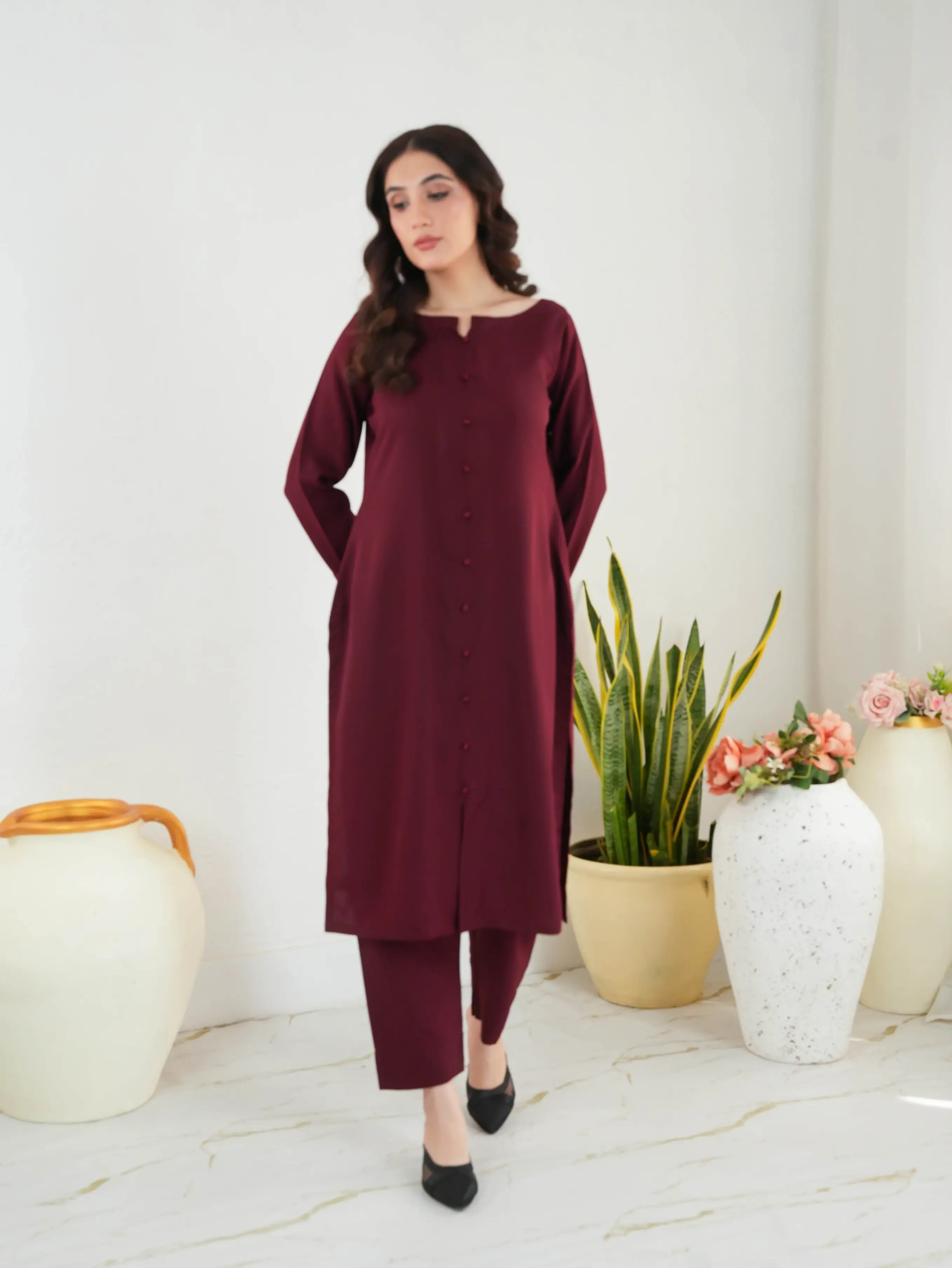 This two-piece suit, crafted from comfortable Crepe lawn fabric in a rich berry/maroon color, is a sophisticated daily essential. The straight-cut shirt features a clean, round neckline and a stylish full-length button placket running down the front. It is perfectly matched with tailored trousers for an elegant and modest silhouette.