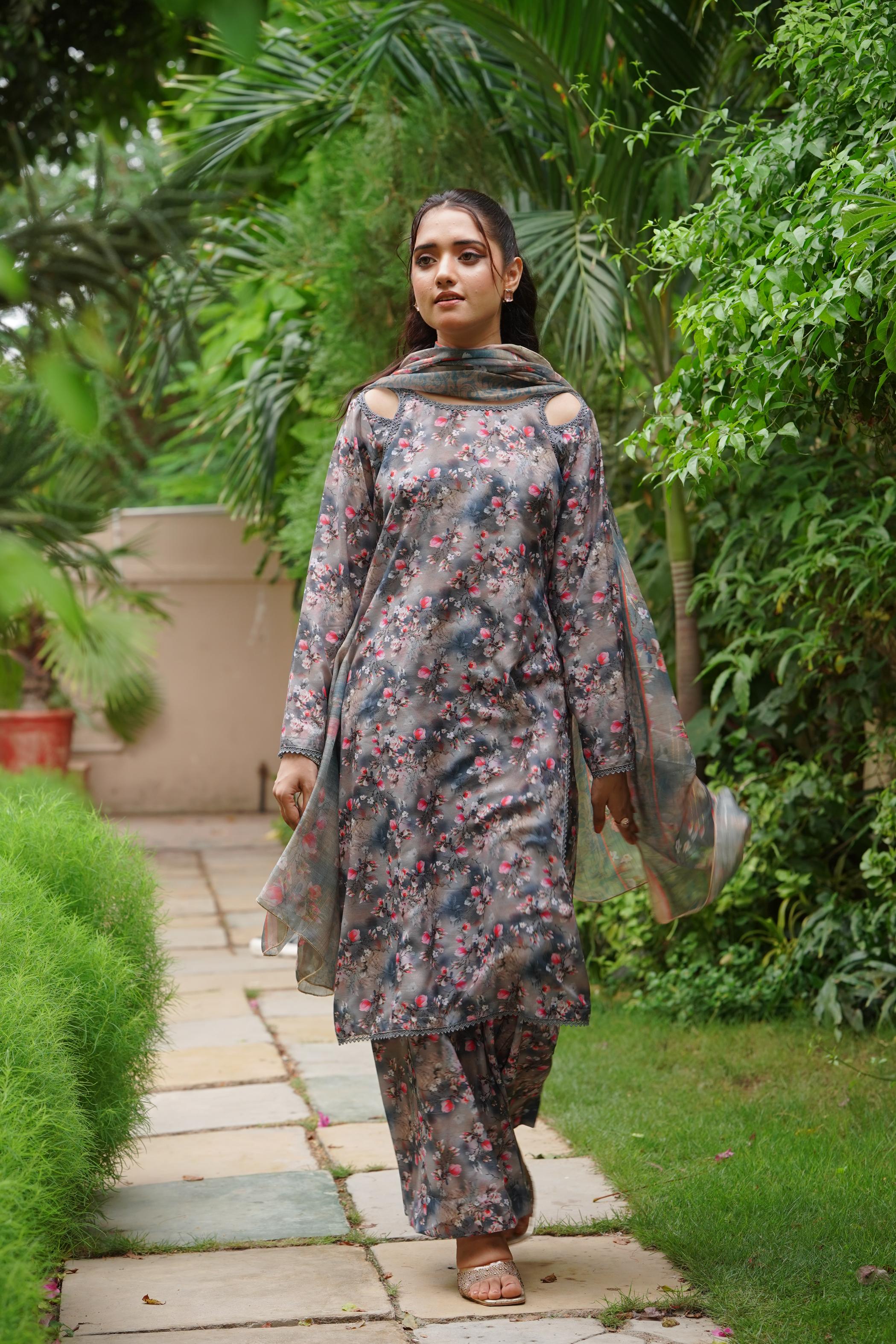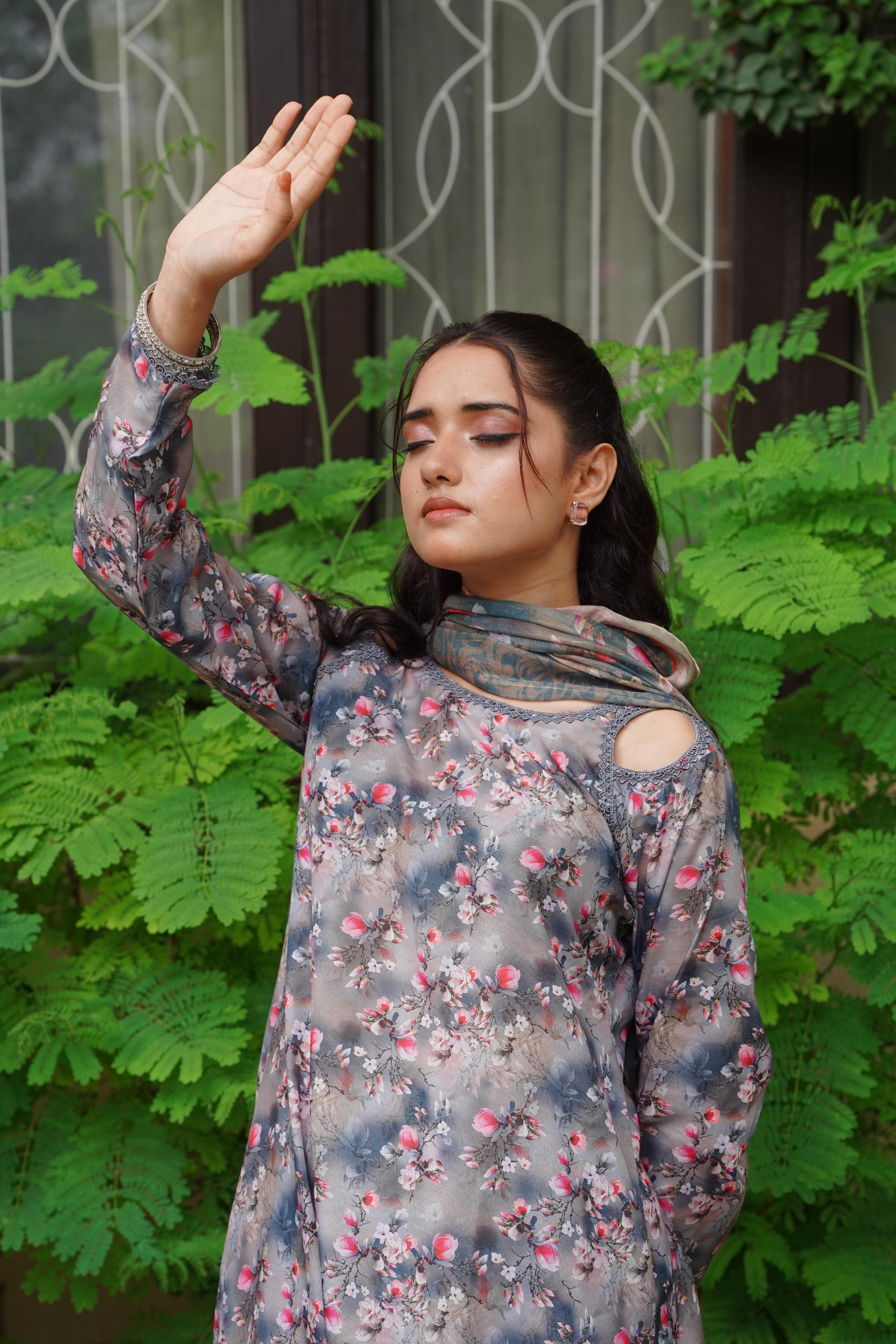 This delightful Swiss lawn printed shirt and trouser set features vibrant patterns that bring a touch of joy to your wardrobe. The elegant lace detailing on the neckline adds a refined touch, while the matching monar printed dupatta completes the look, making it perfect for any casual or festive occasion.