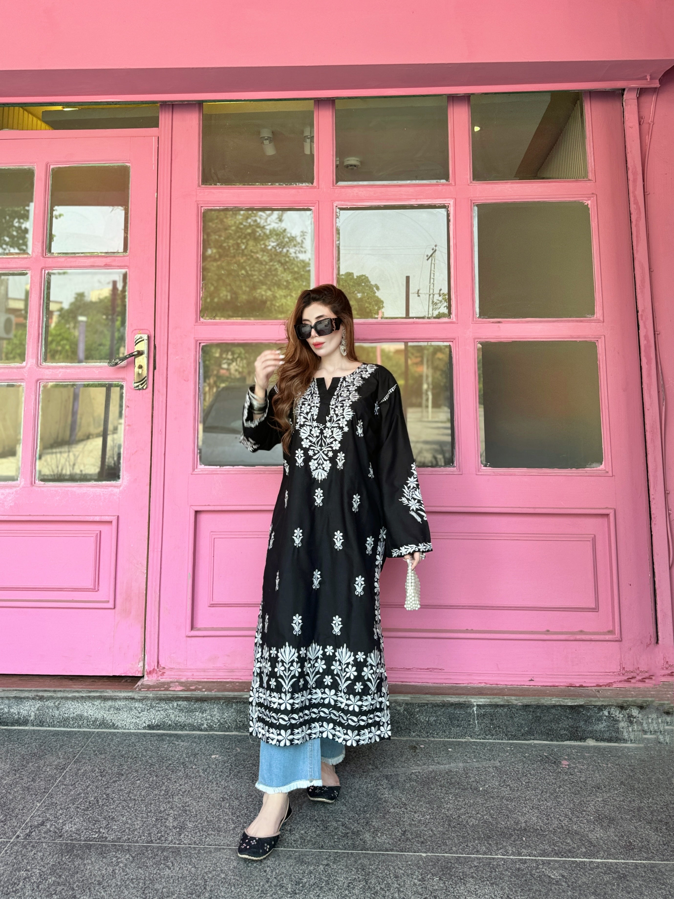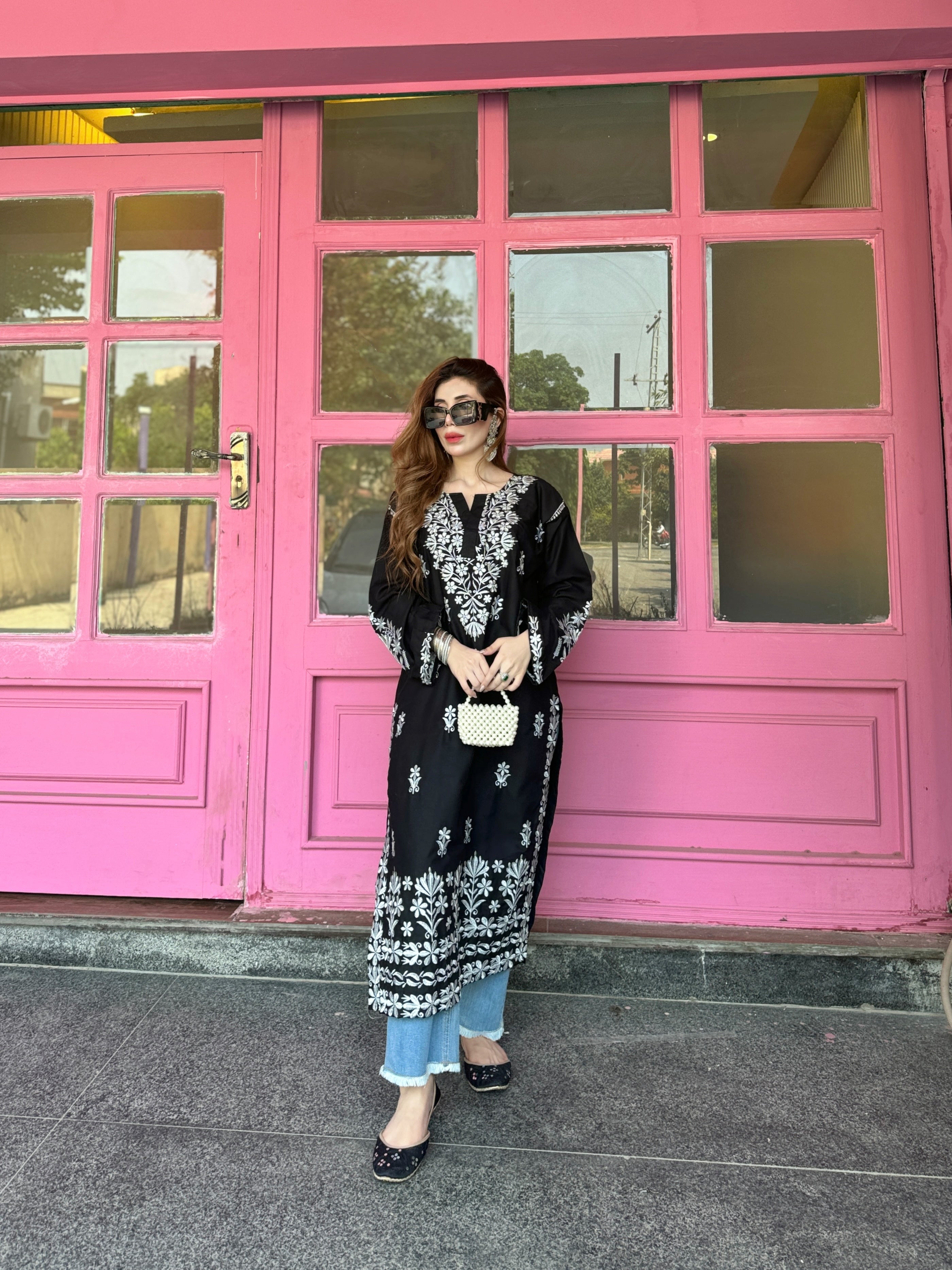 Classic black chikankari kurti adorned with intricate white thread embroidery. Timeless, versatile, and effortlessly chic.