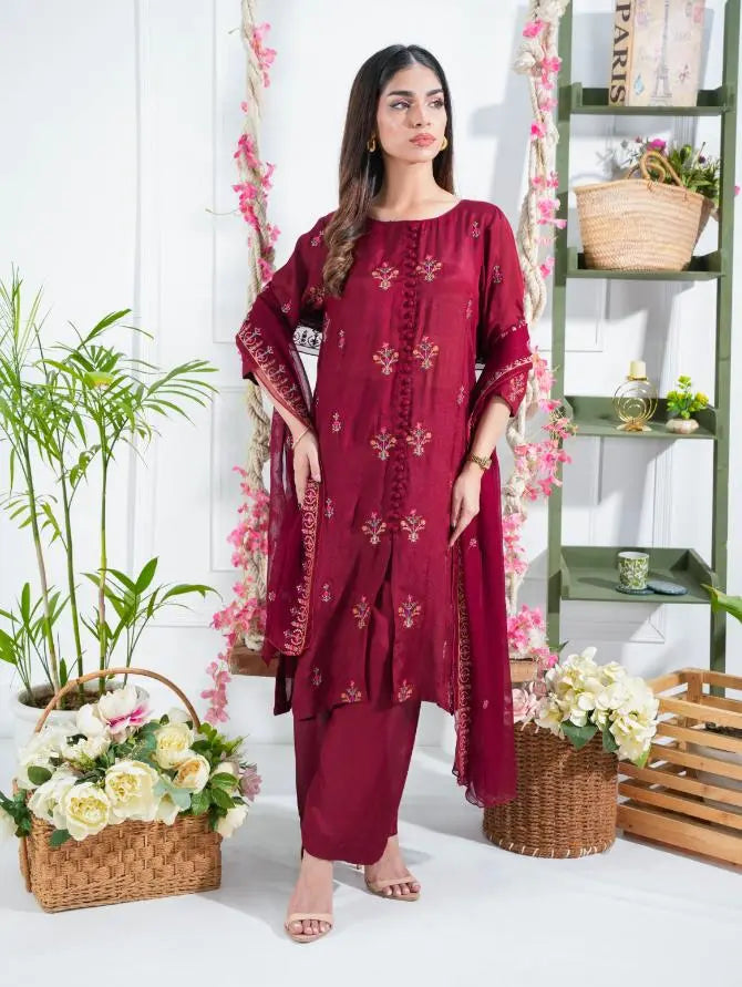 This elegant three-piece suit is crafted from luxurious raw silk, featuring an open shirt with front buttons and matching raw silk trousers. The ensemble is beautifully complemented by a chiffon dupatta, which is delicately embroidered to complete the look.
