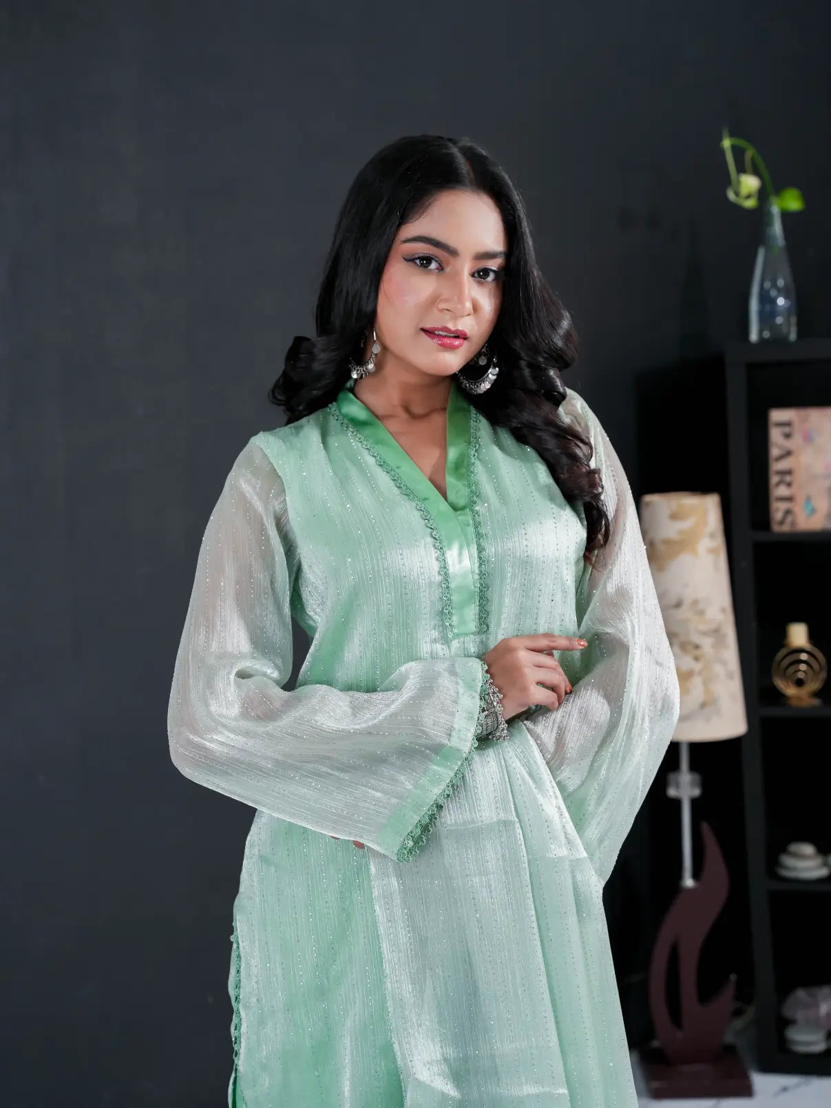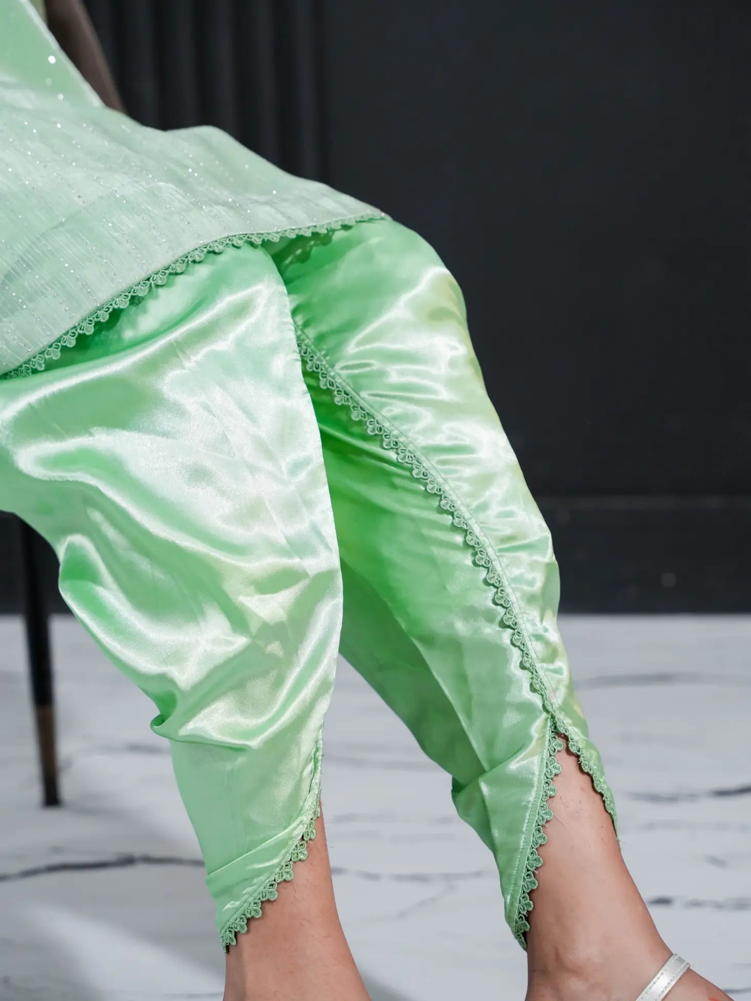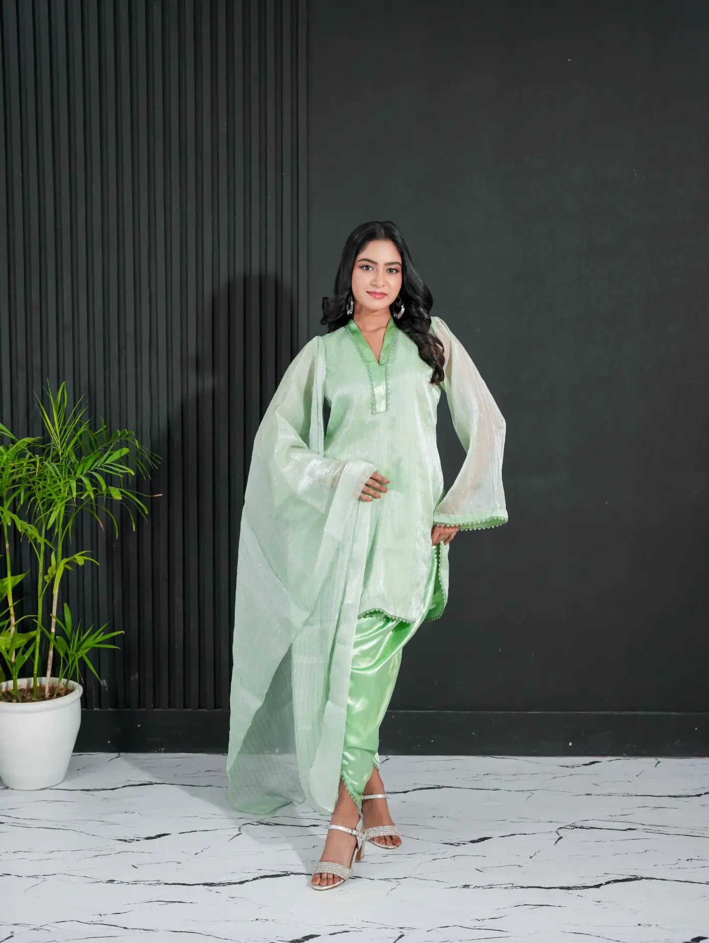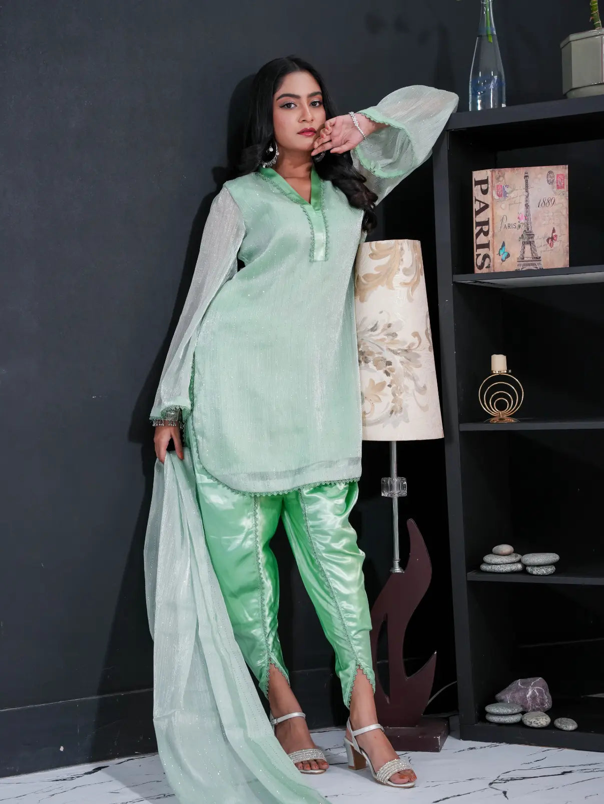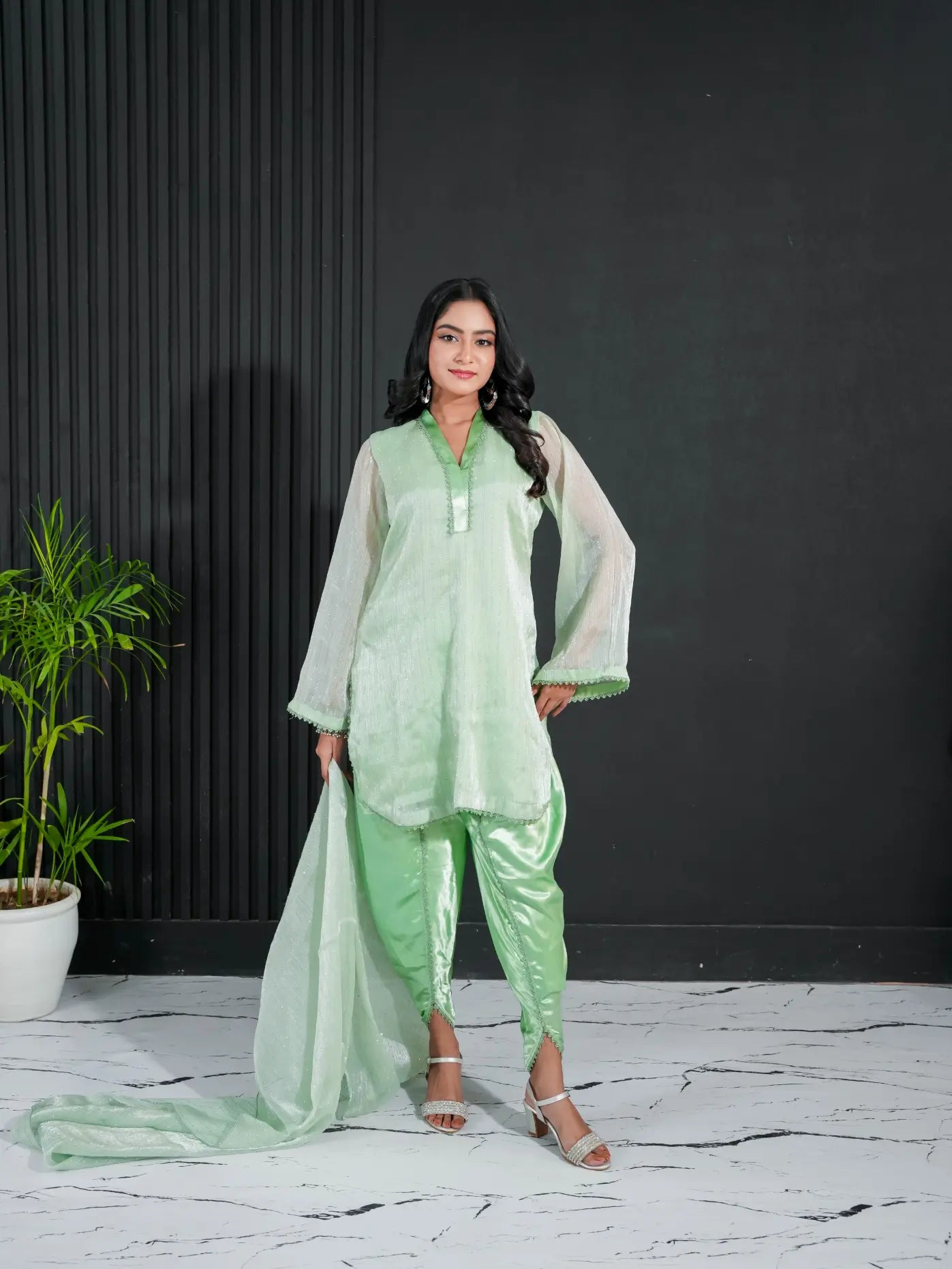 Indulge in the luxury of this exquisite three-piece suit. It features a graceful Lava Silk shirt and matching dupatta, both enhanced by intricate lace detailing for an elegant finish. The ensemble is completed with contemporary Silk tulip trousers, creating a sophisticated and flowy silhouette perfect for any festive or formal occasion.