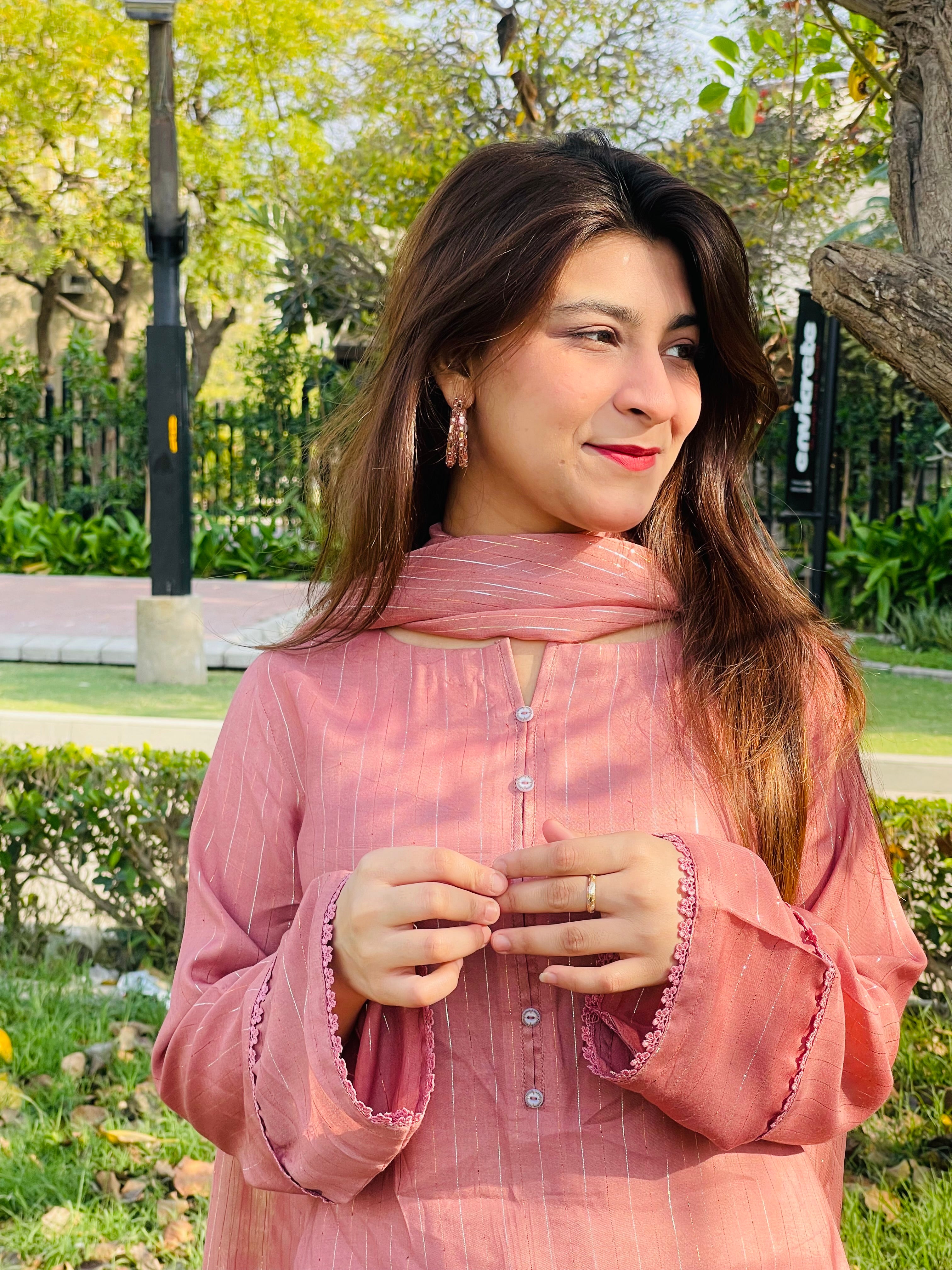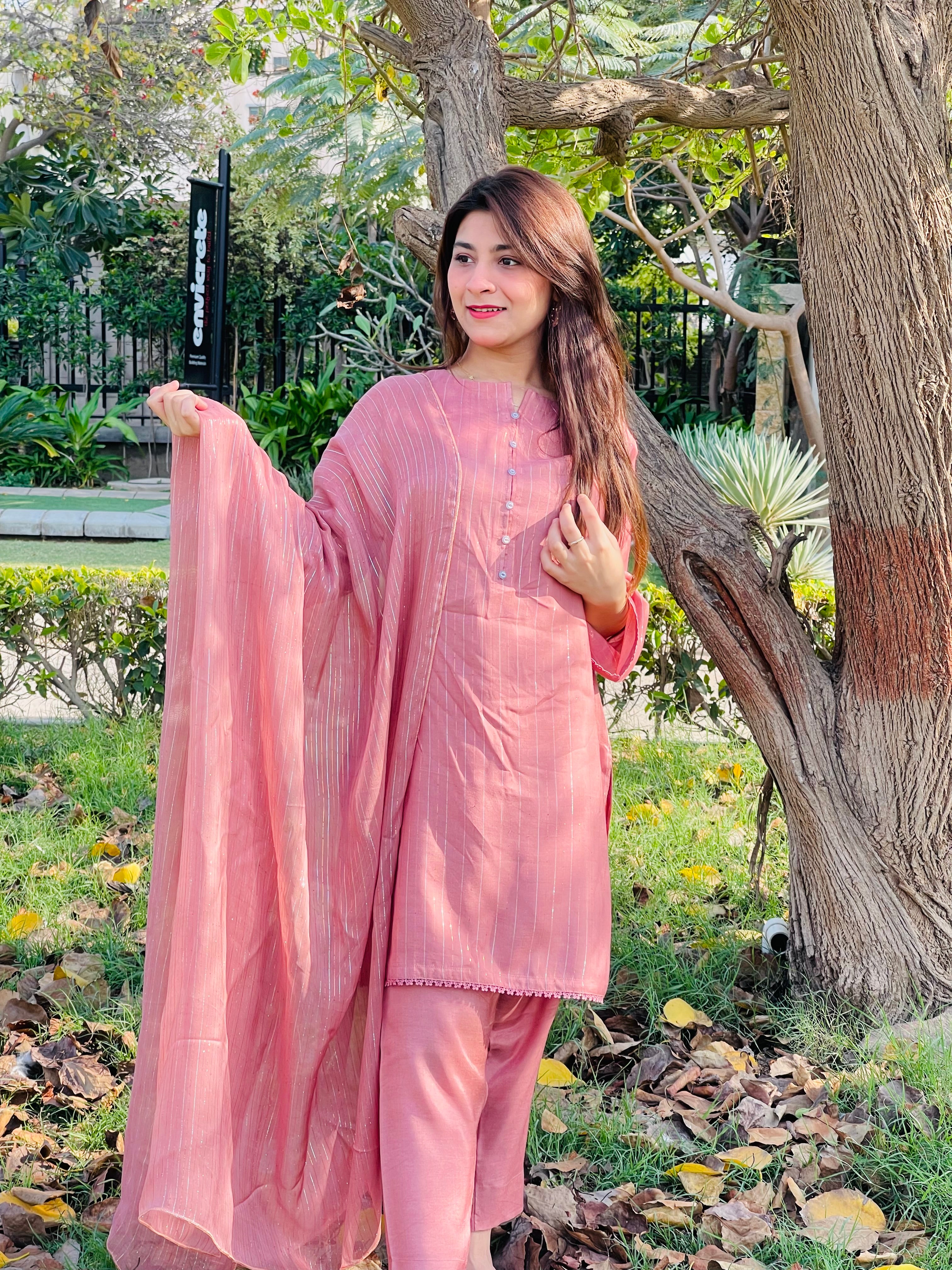 This refined set features a buttoned neckline Cotton Silk shirt, paired with matching trousers and a delicate Chiffon zari dupatta, perfect for any occasion.