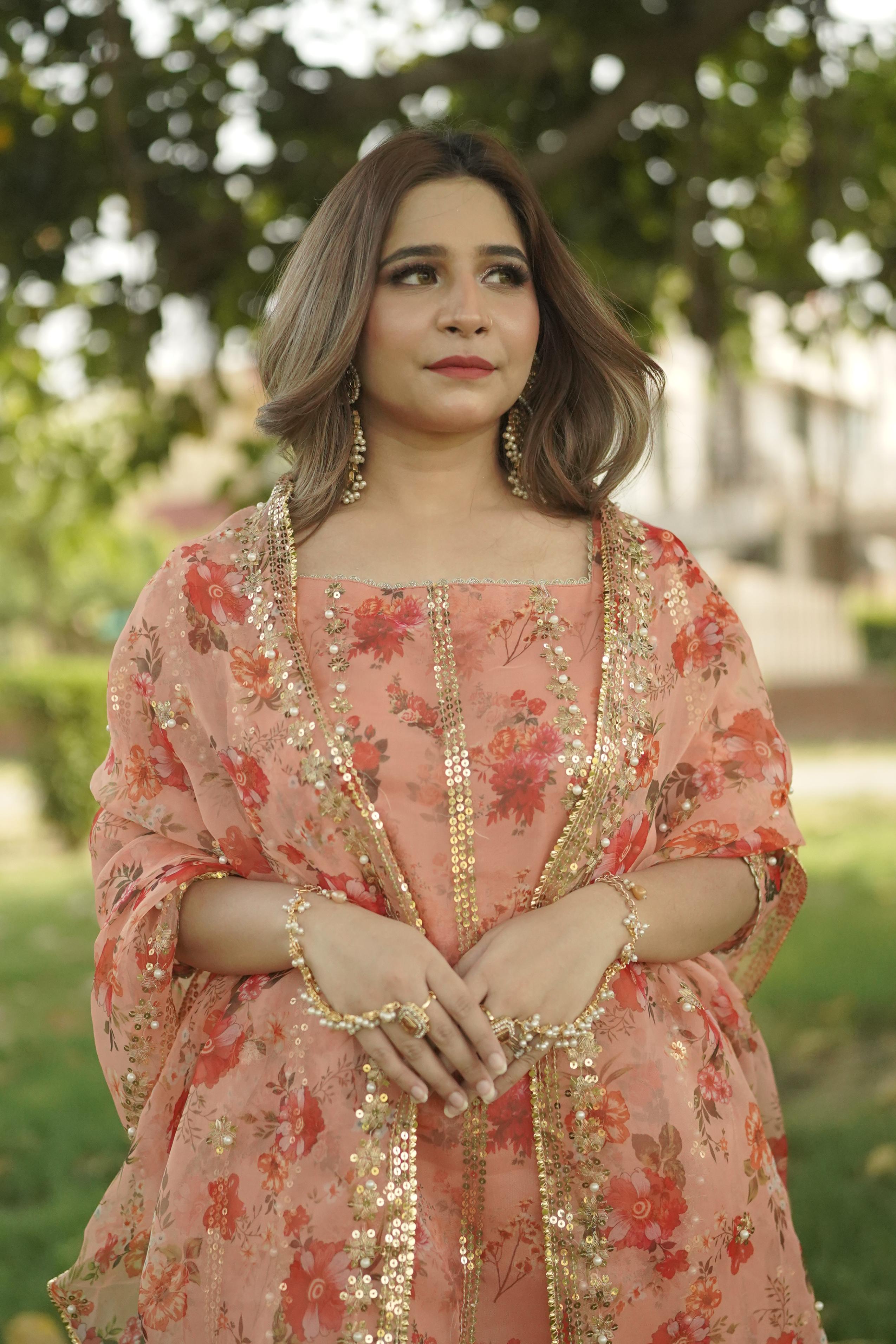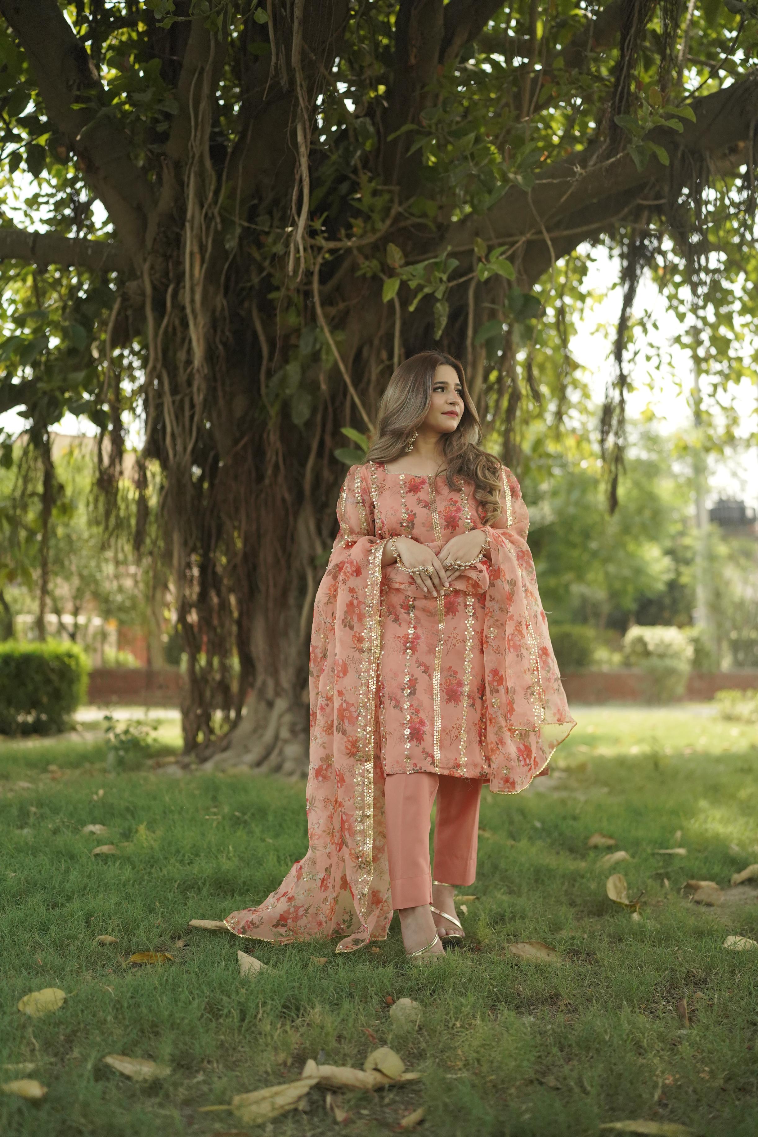 This stylish set features a printed organza shirt adorned with gold embroidery, bringing a touch of luxury to the design. Paired with a matching printed organza dupatta and sleek crepe trousers, it’s perfect for those who love a blend of elegance and modern flair.