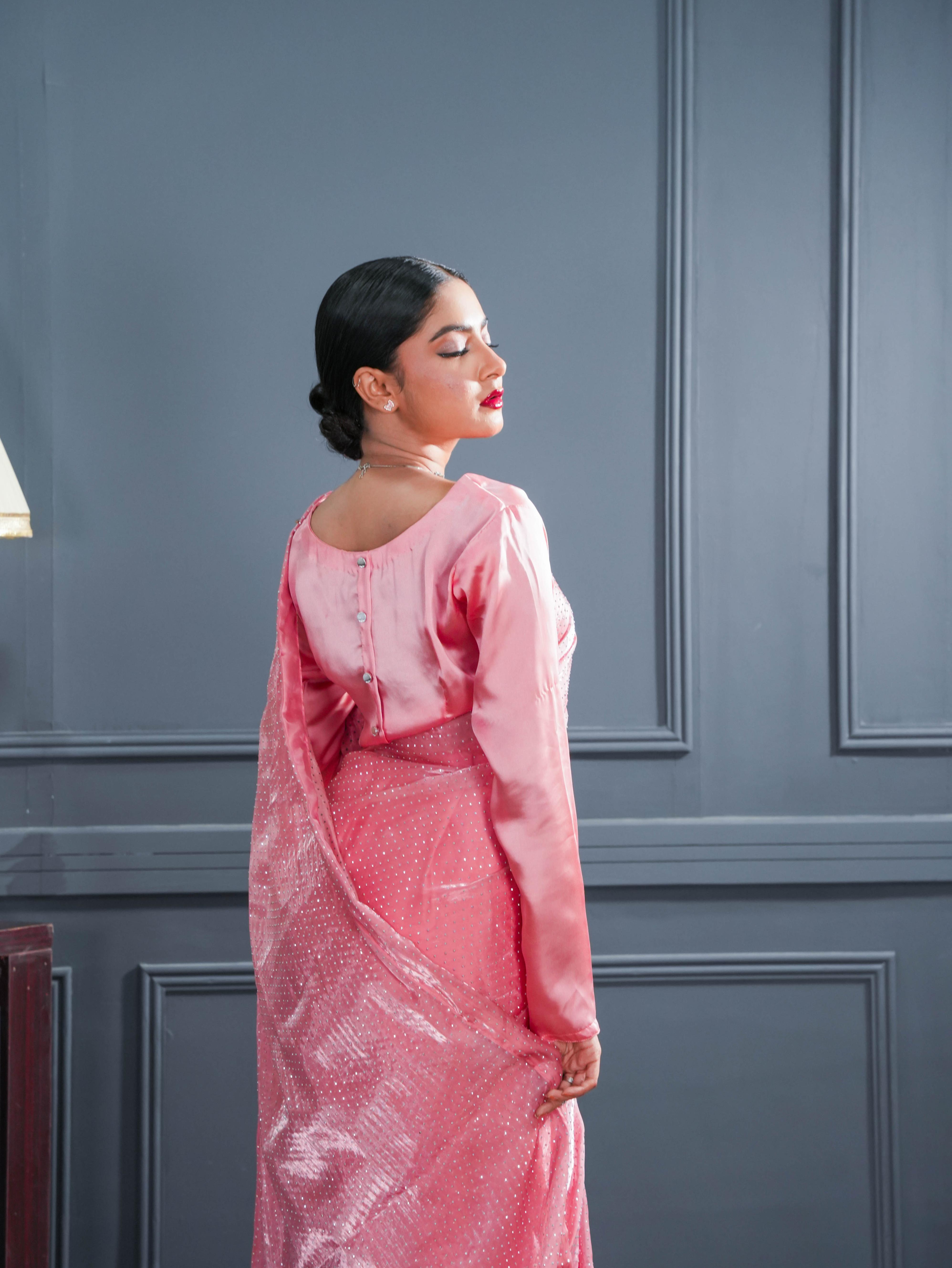 Feminine and fluid, this Peach Stone Saree is crafted from luxurious lava silk that drapes like a dream. The delicate shimmer of the fabric is complemented by a net blouse and a malayi crepe petticoat, creating a look that’s soft, radiant, and effortlessly elegant — perfect for festive evenings or intimate celebrations.