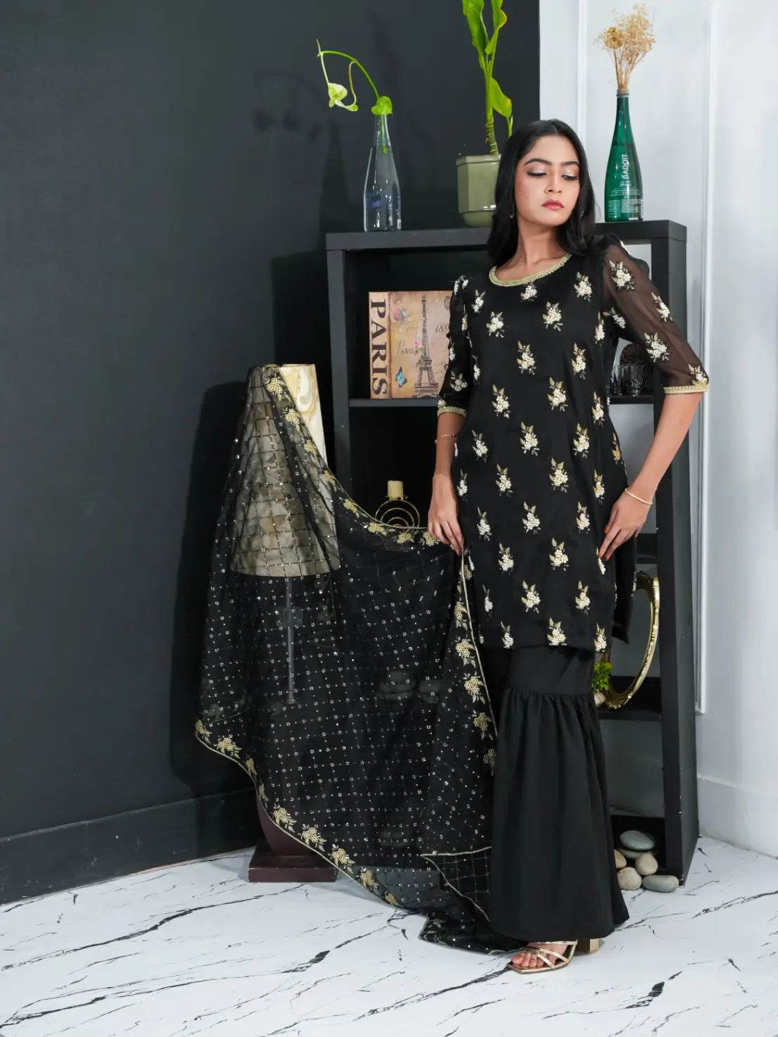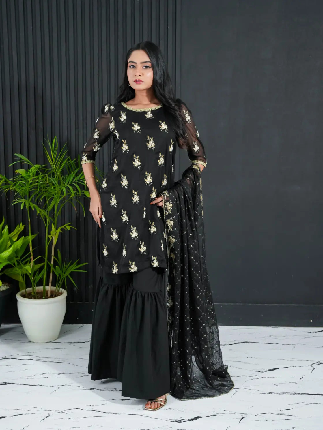 Make a captivating statement in this elegant three-piece suit. It features a flowing Chiffon shirt with contemporary puffy sleeves for a touch of volume. The look is grounded by a dramatic Malayi crepe garara, and completed with a beautifully embroidered Chiffon dupatta. This ensemble perfectly balances traditional flair with modern sophistication.