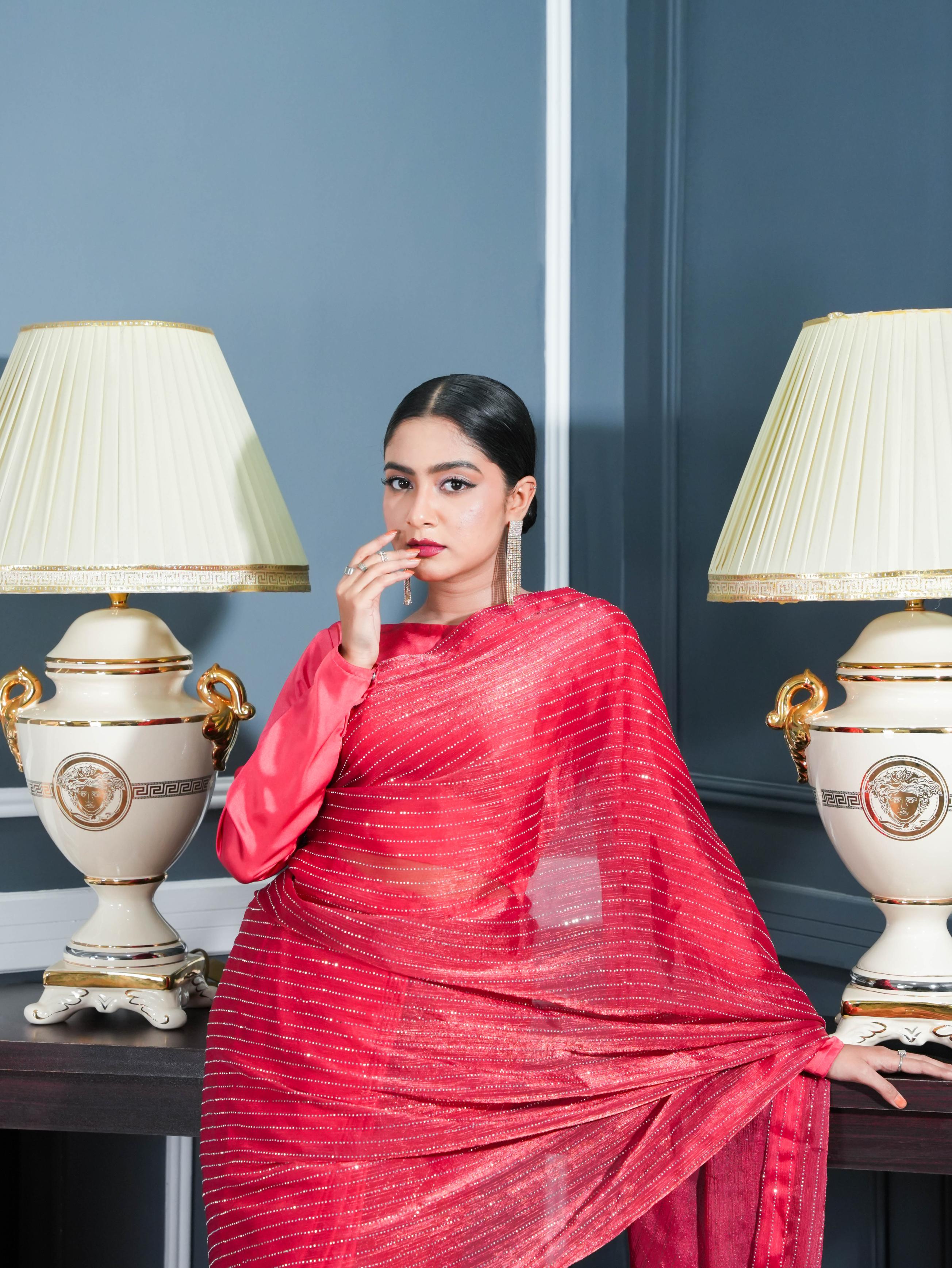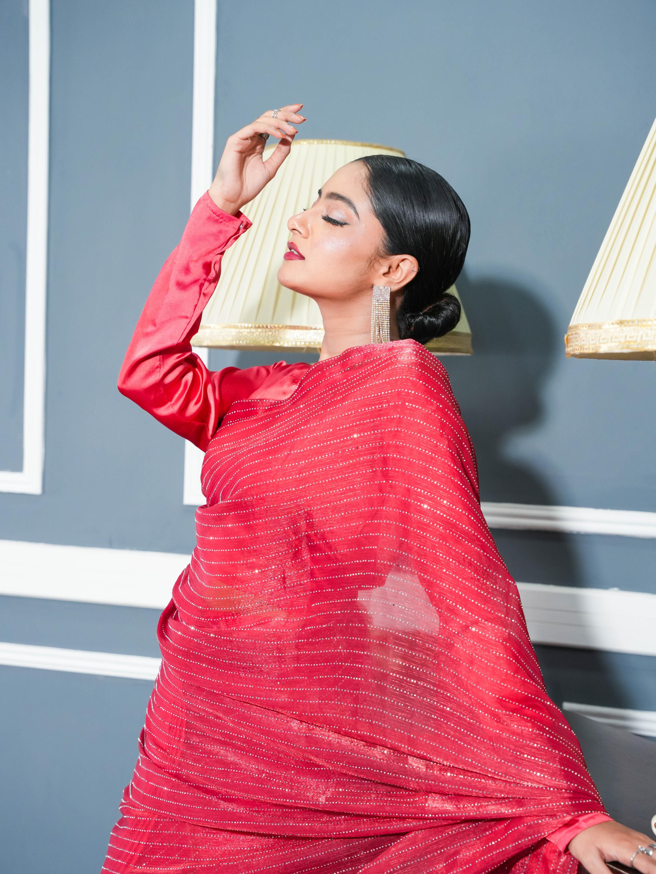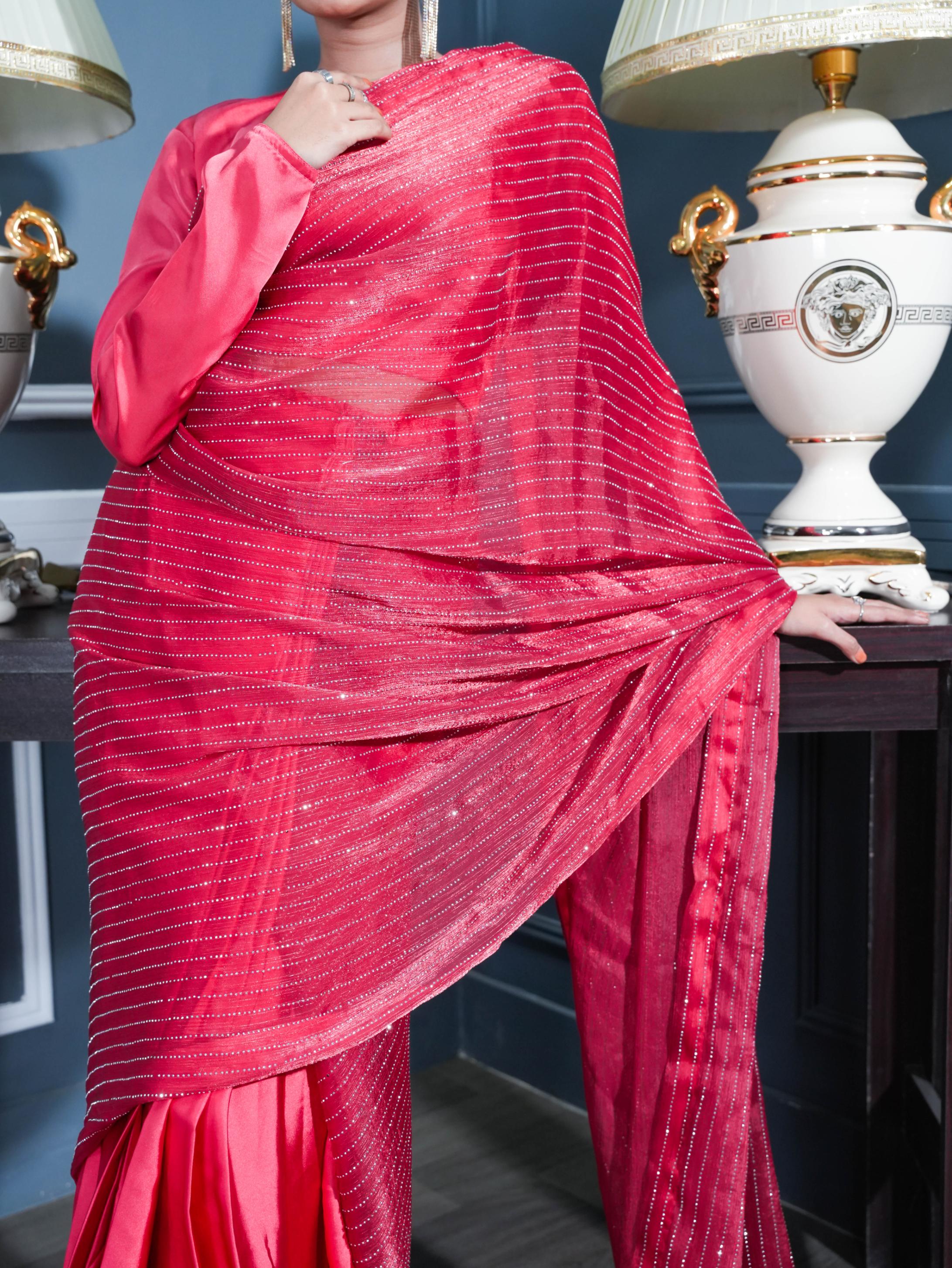 Drape yourself in elegance with the Red Stone Saree—crafted from rich lava silk for a fluid fall and graceful movement. The delicately embellished net blouse adds a sheer charm, while the malayi crepe petticoat ensures a comfortable fit all day long. A refined ensemble that blends tradition with contemporary allure.