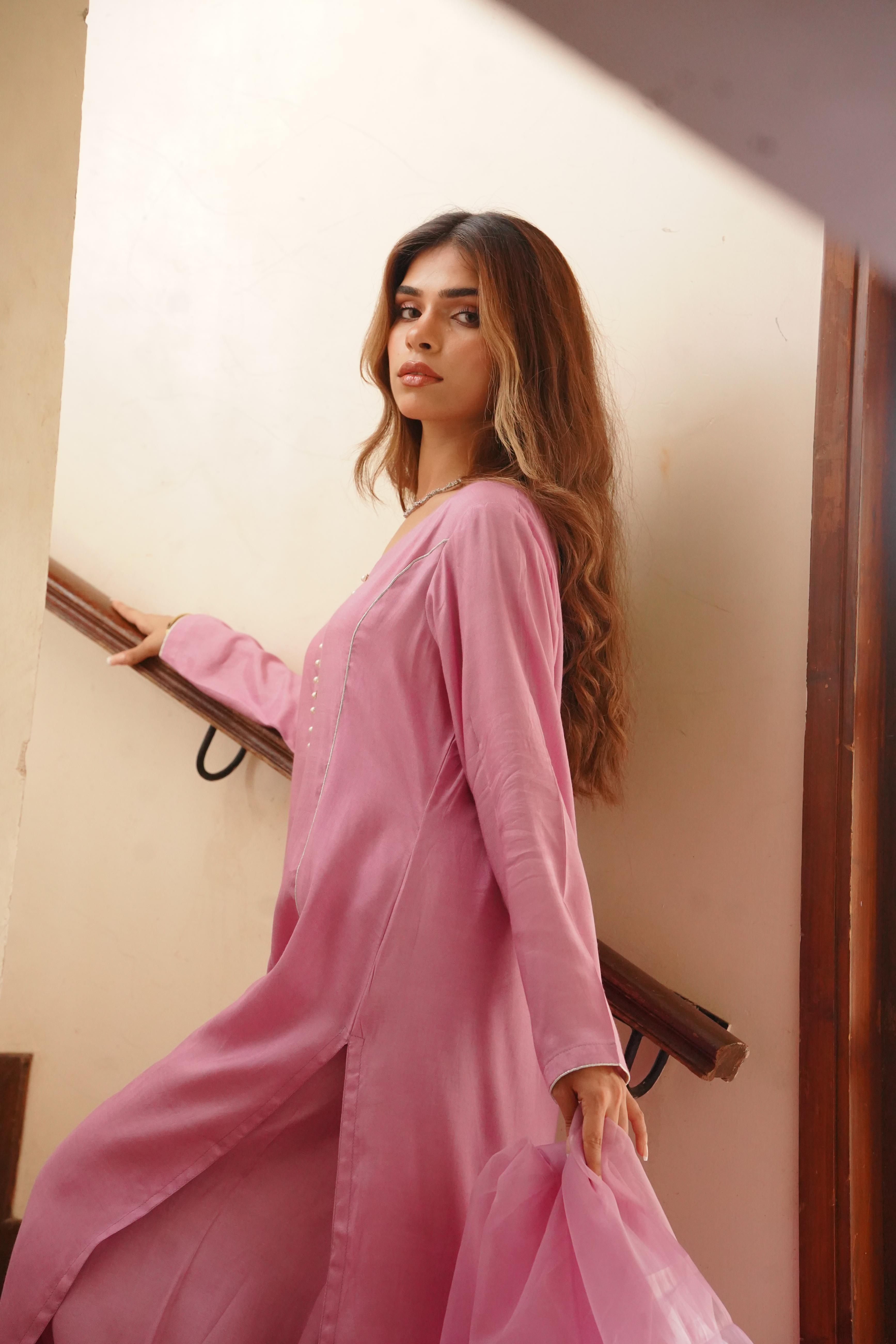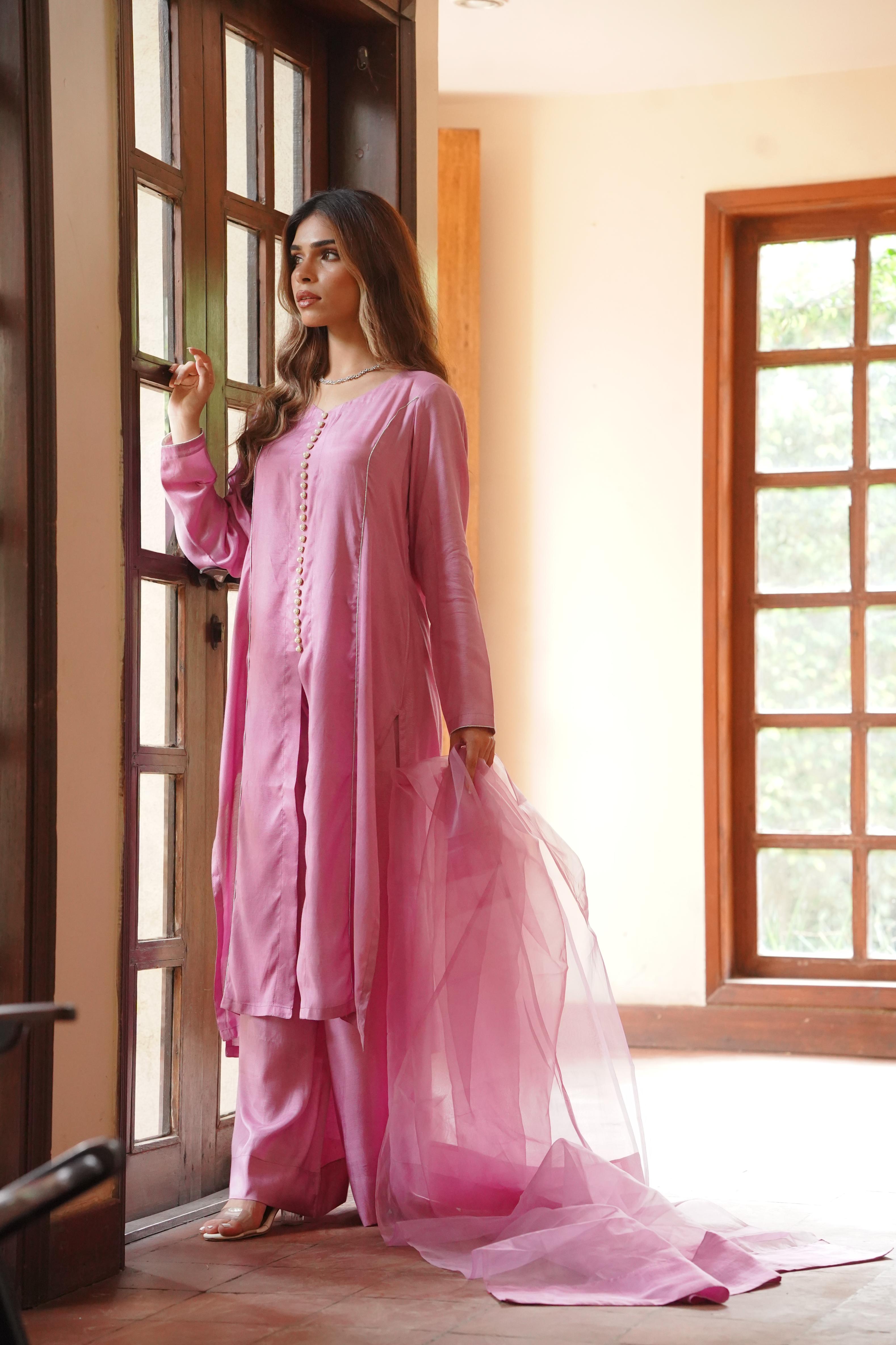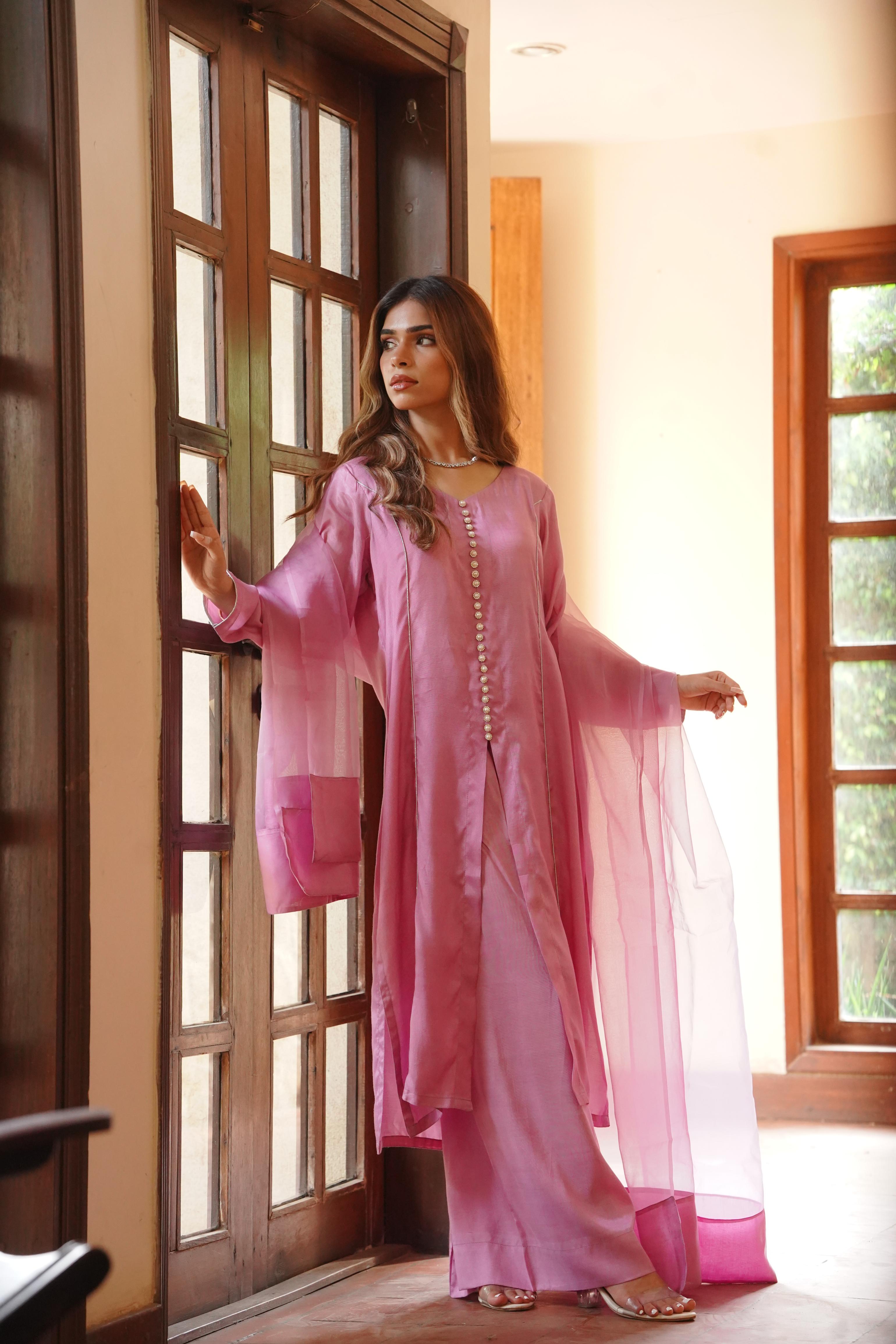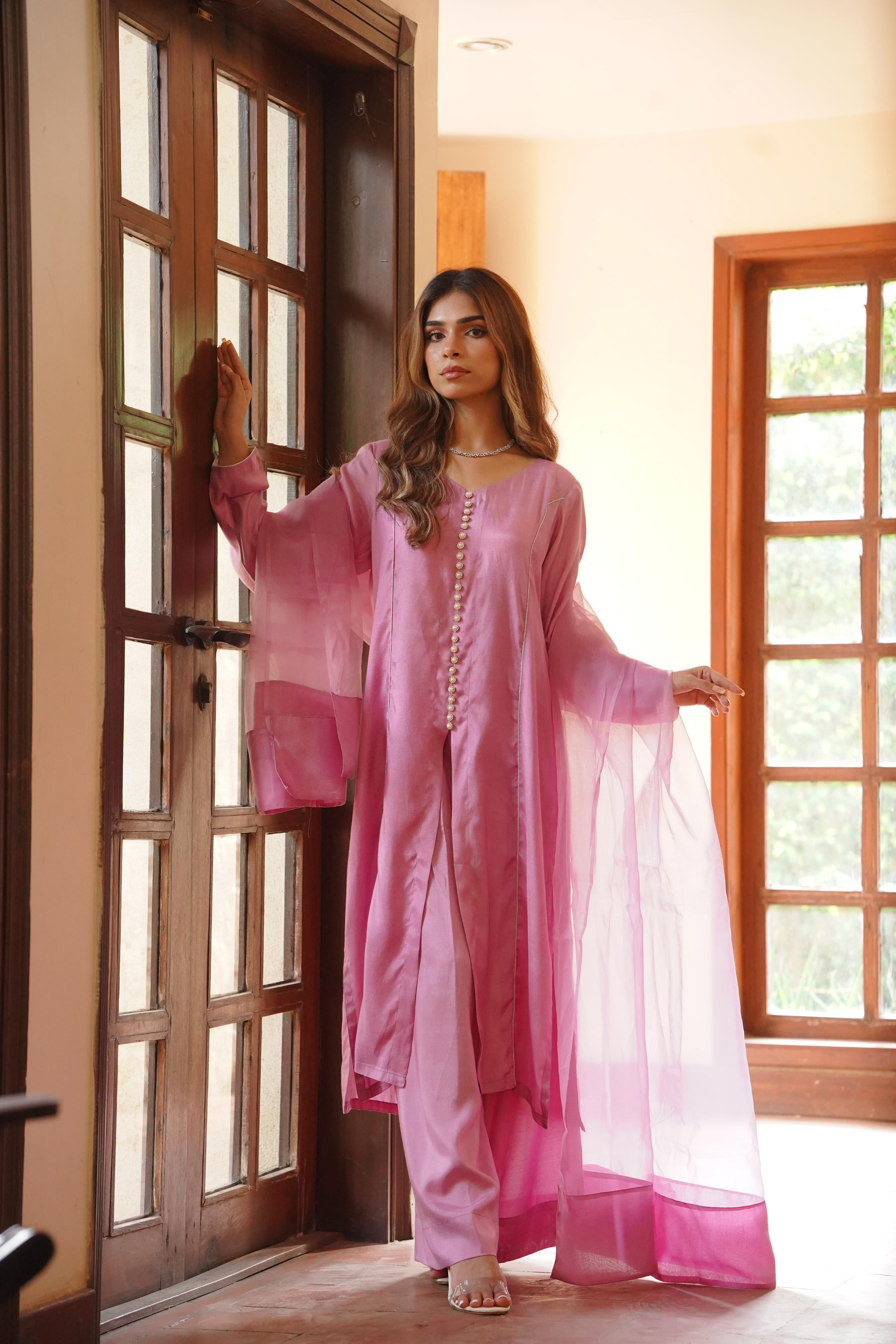 This modern classic features a cotton silk front-open shirt that exudes effortless charm, complete with chic button detailing. The matching cotton silk trouser ensures a coordinated look, while the airy organza dupatta adds a layer of grace, perfect for dressing up or down.