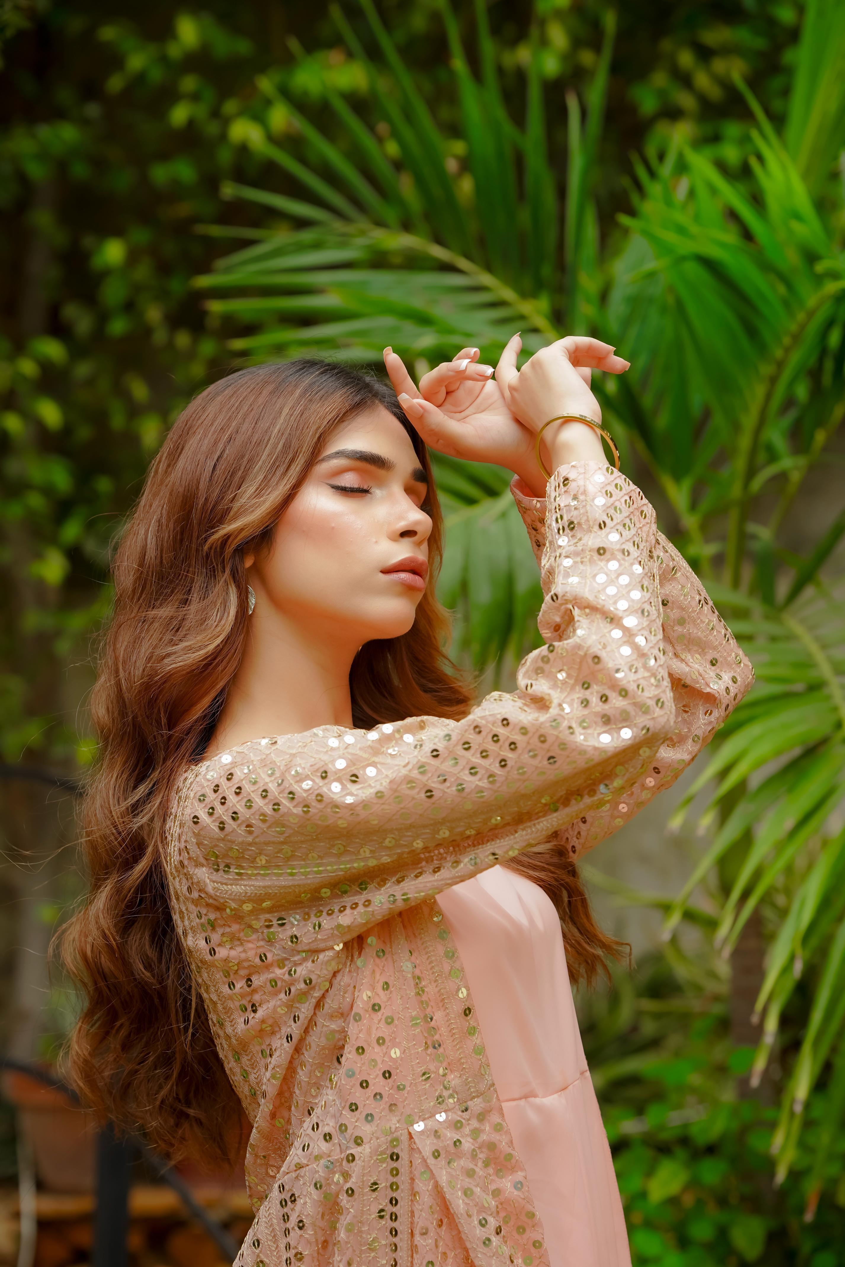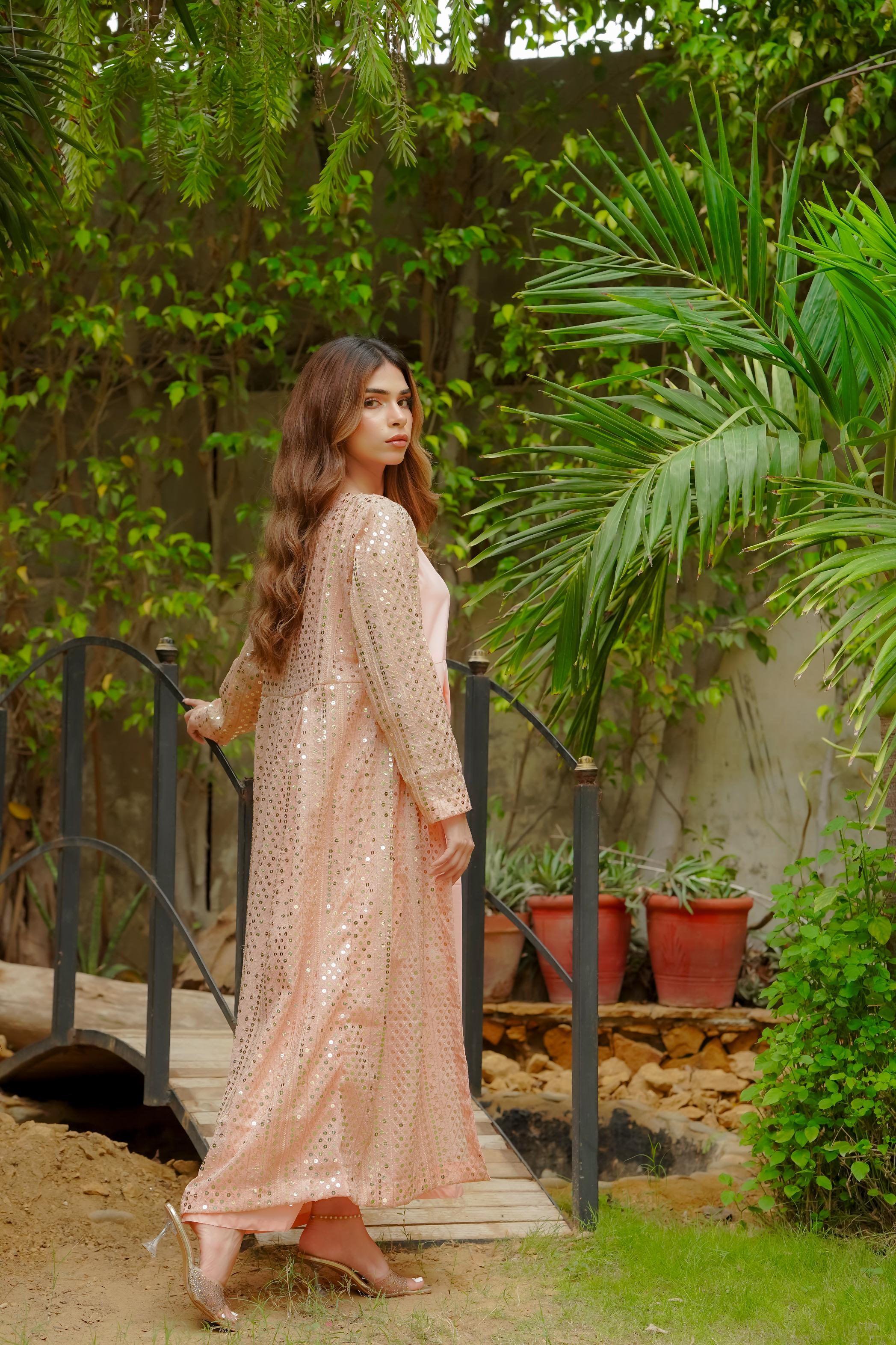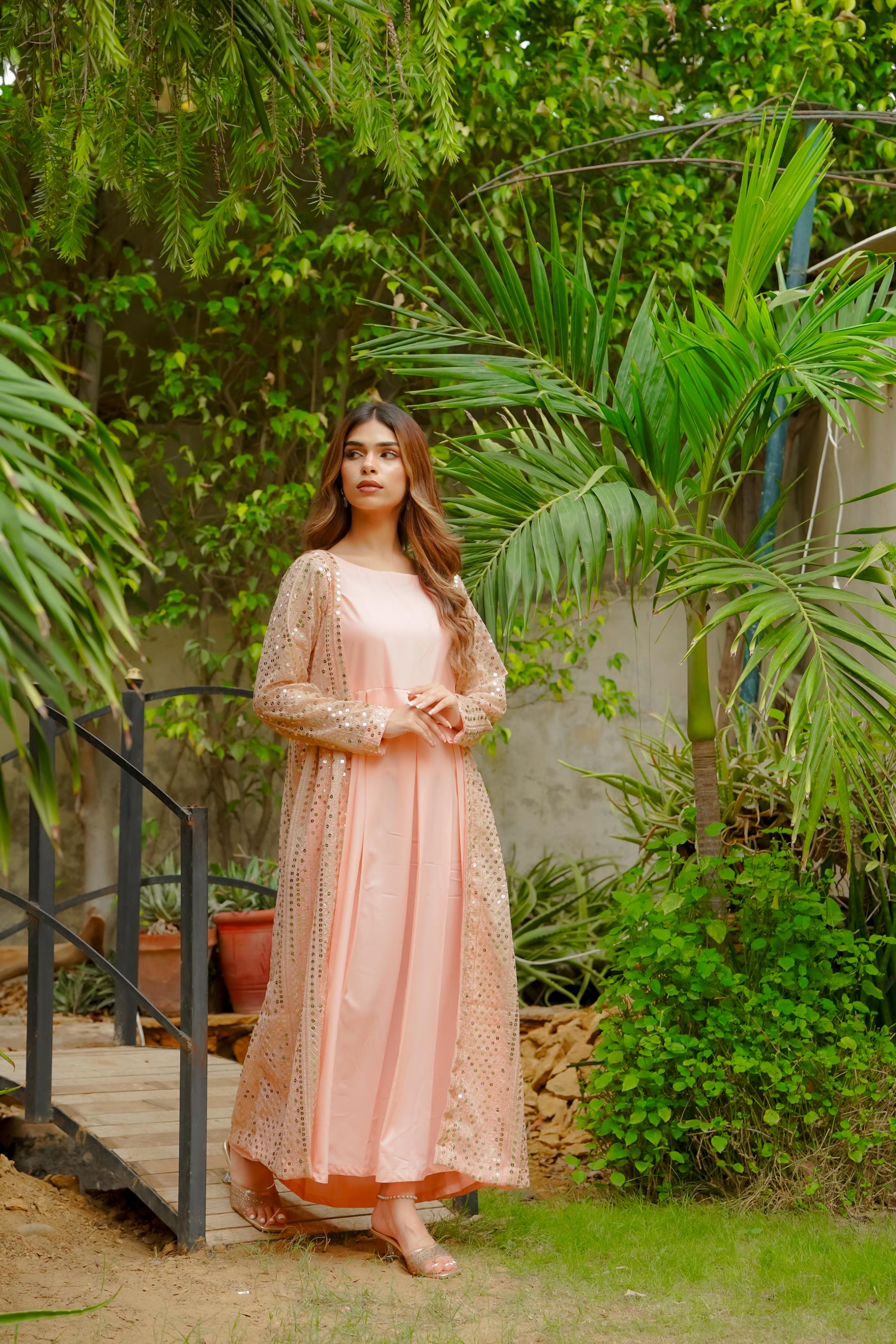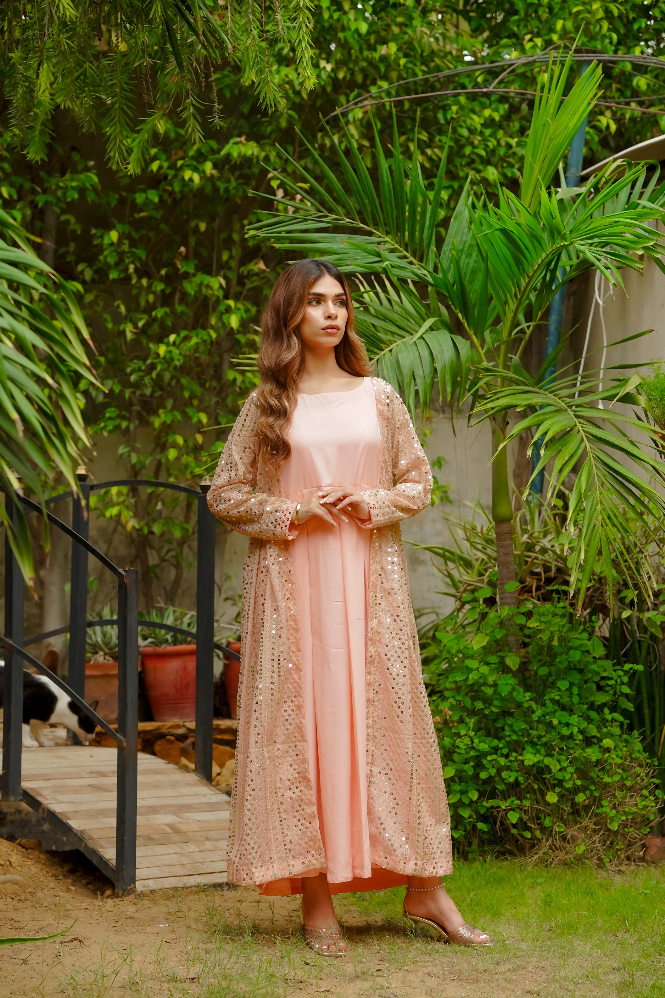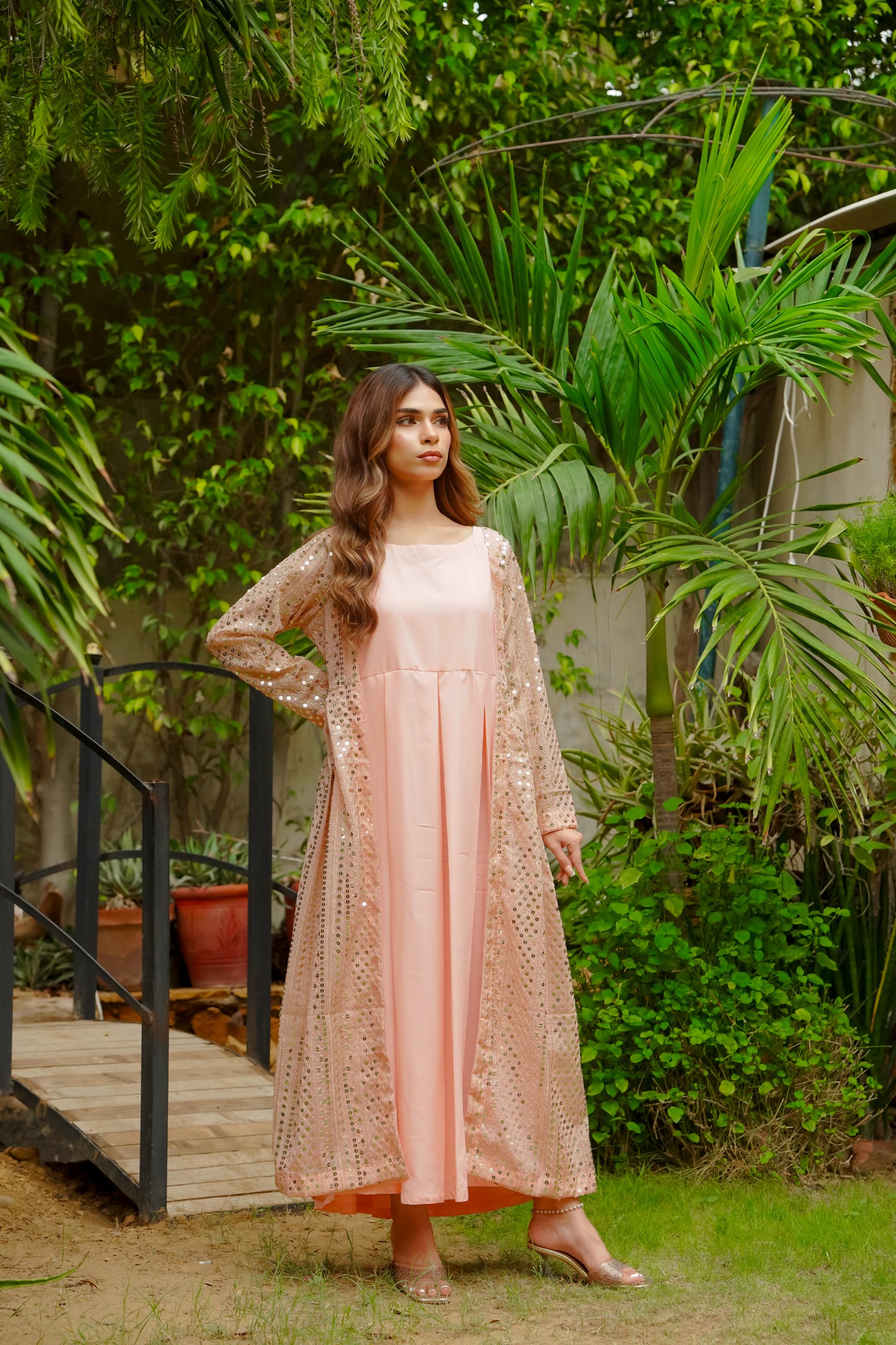 This elegant 2-piece ensemble features a shimmering chiffon long coat adorned with delicate sequins, adding a touch of glamour. The sleeveless Malayi crepe frock underneath offers a sleek, comfortable fit, making it a perfect pairing for both formal and semi-formal occasions