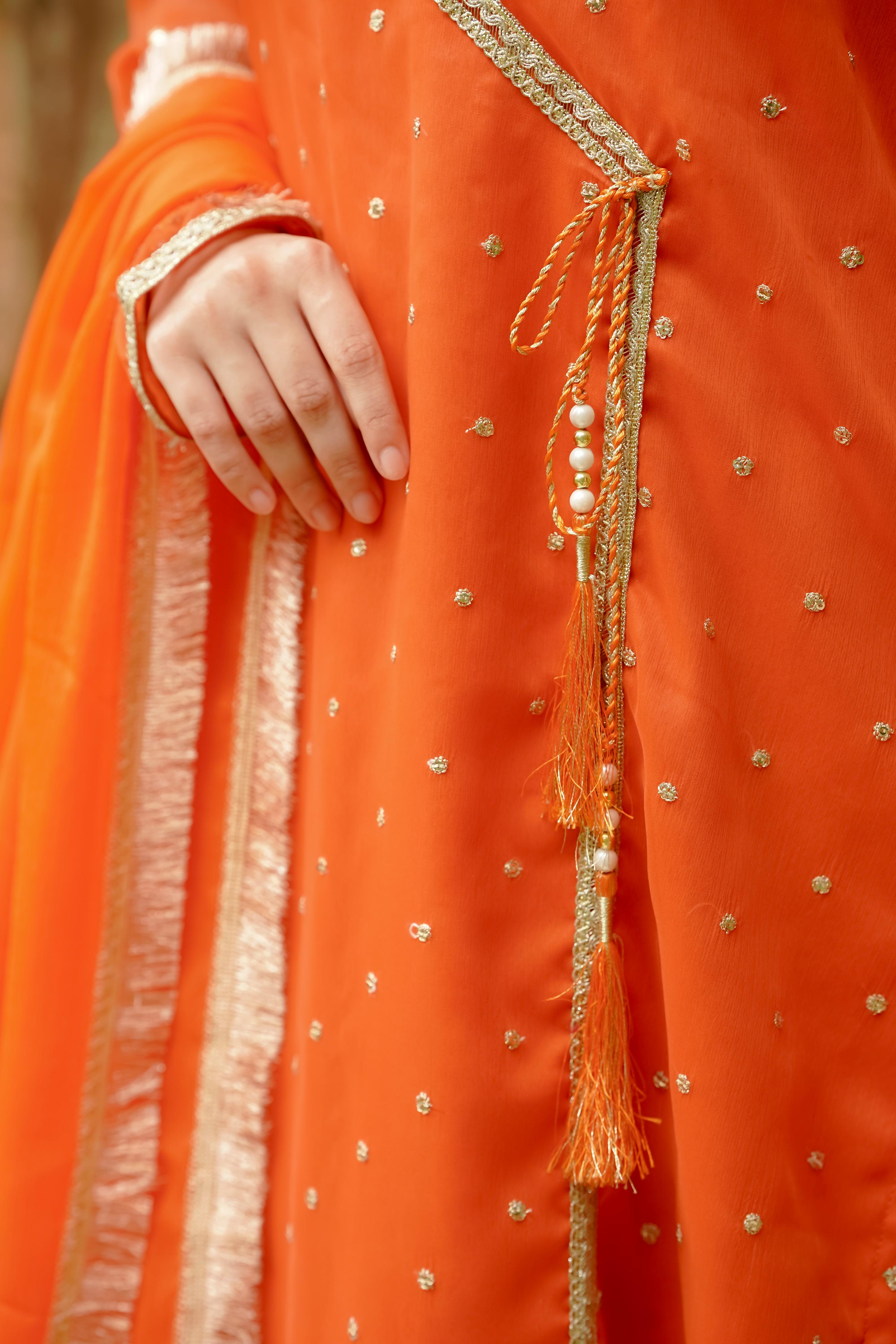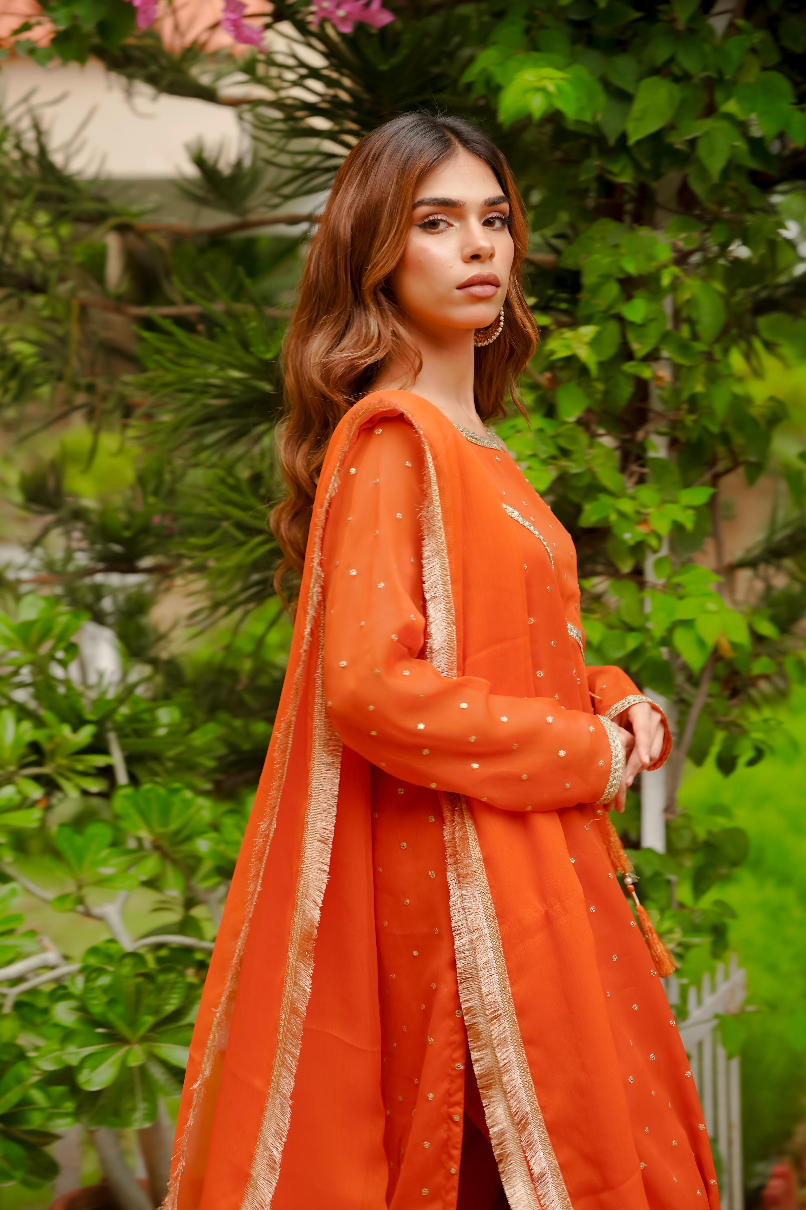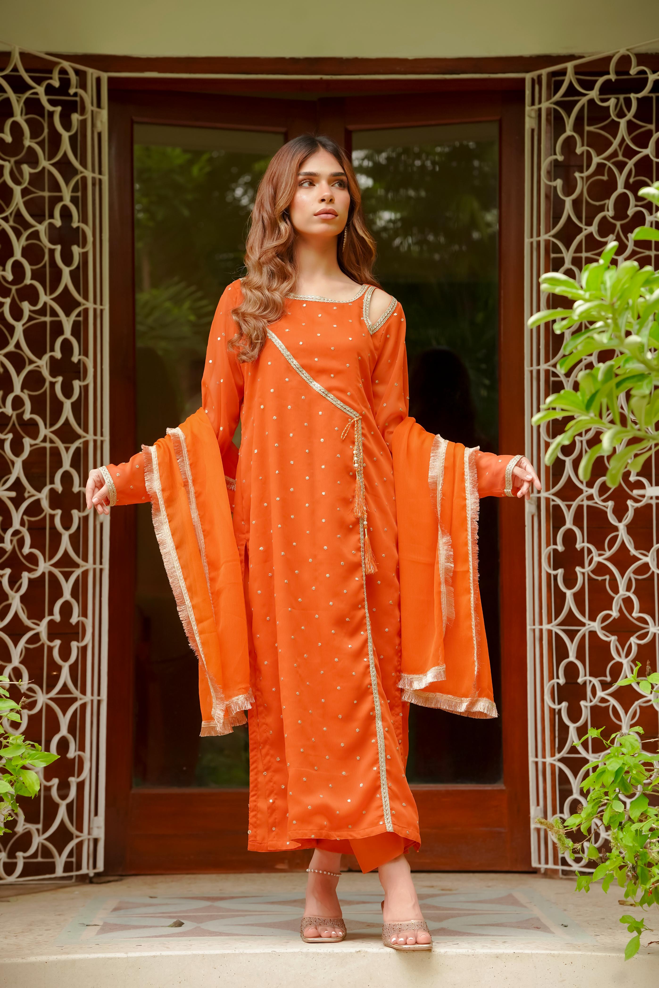This stunning 3-piece ensemble highlights an angrakha-style chiffon shirt, embellished with gold lace and a perfectly coordinated dori. Paired with a matching dupatta and Malayi crepe trouser, this outfit brings together elegance and refinement
