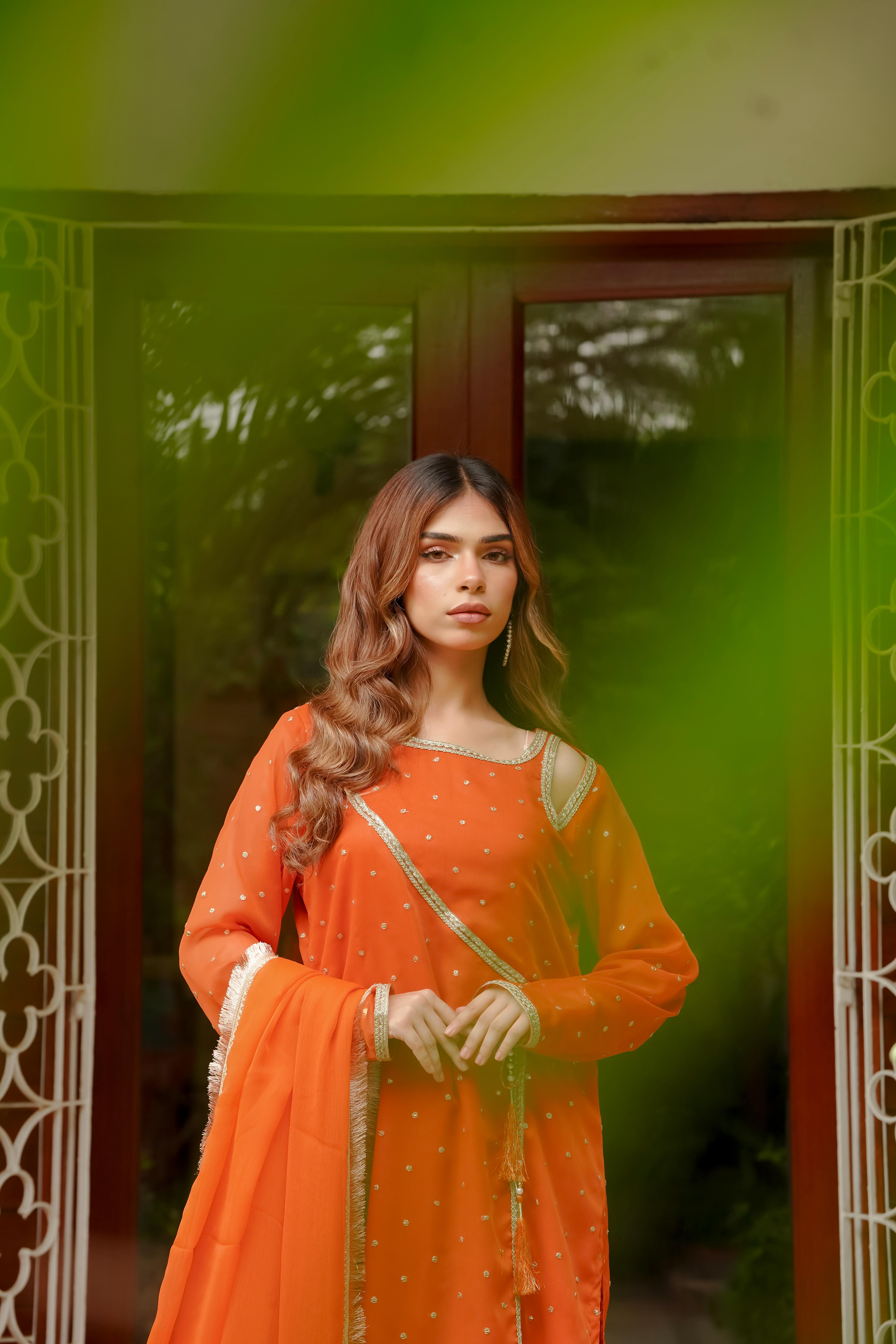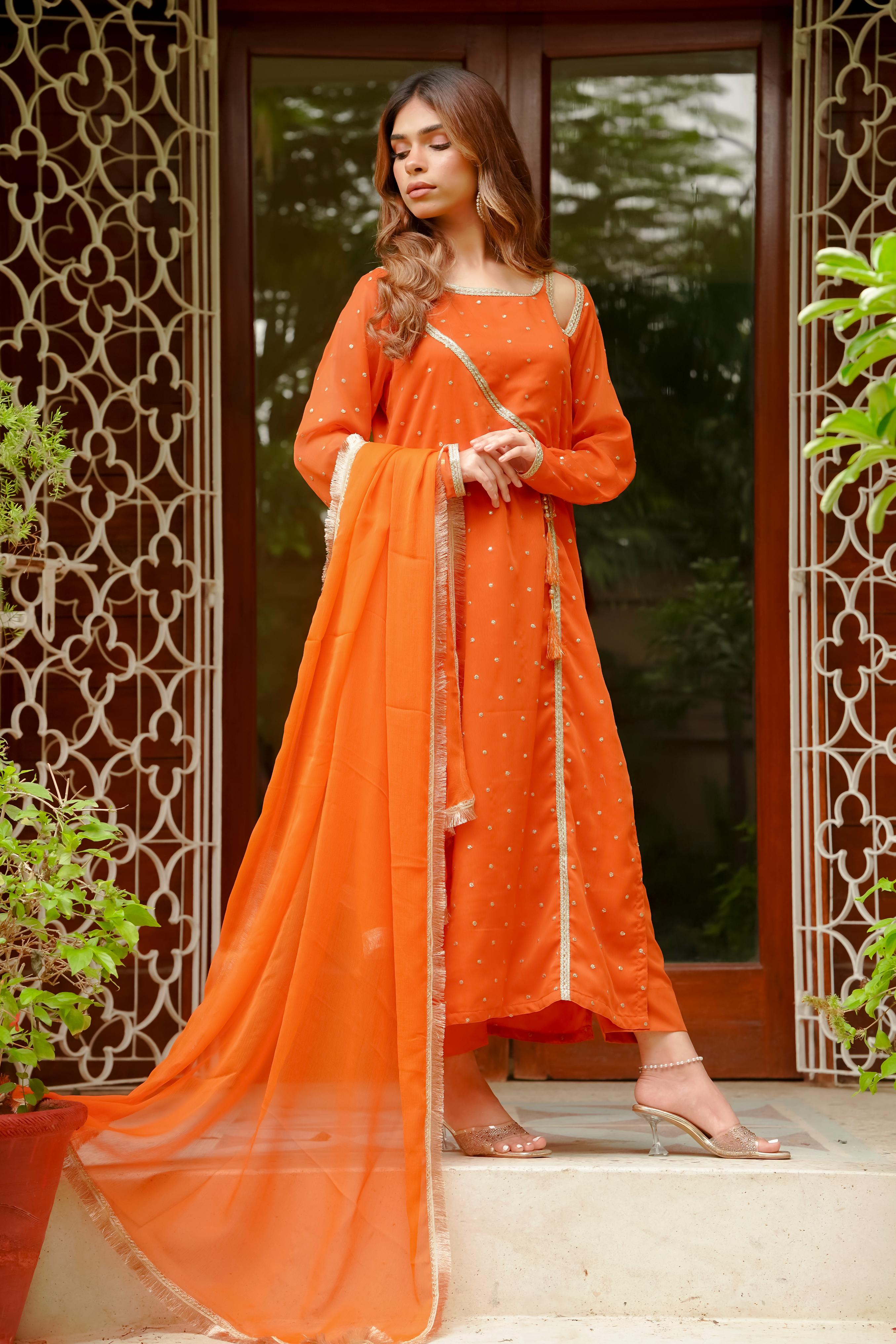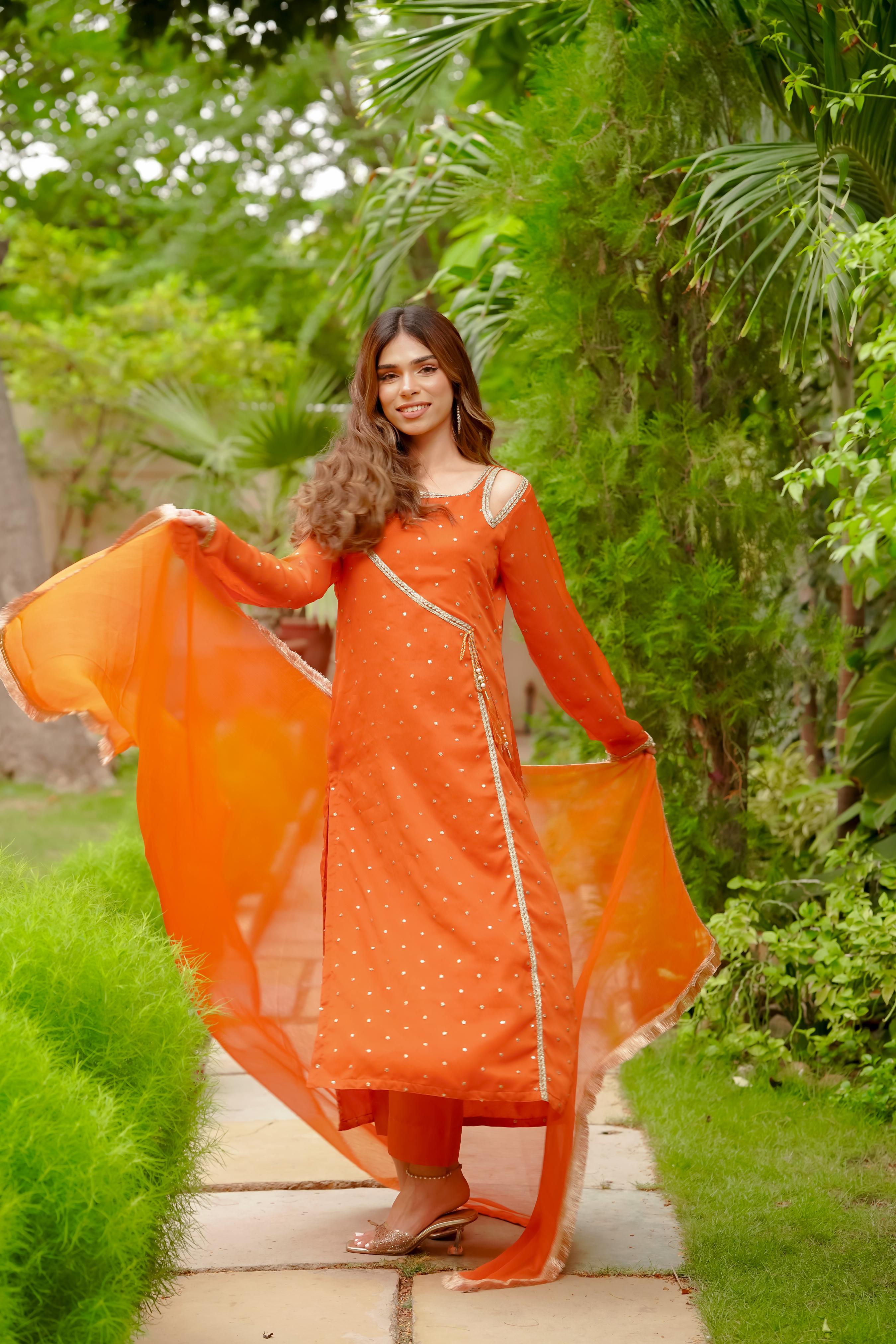 This stunning 3-piece ensemble highlights an angrakha-style chiffon shirt, embellished with gold lace and a perfectly coordinated dori. Paired with a matching dupatta and Malayi crepe trouser, this outfit brings together elegance and refinement