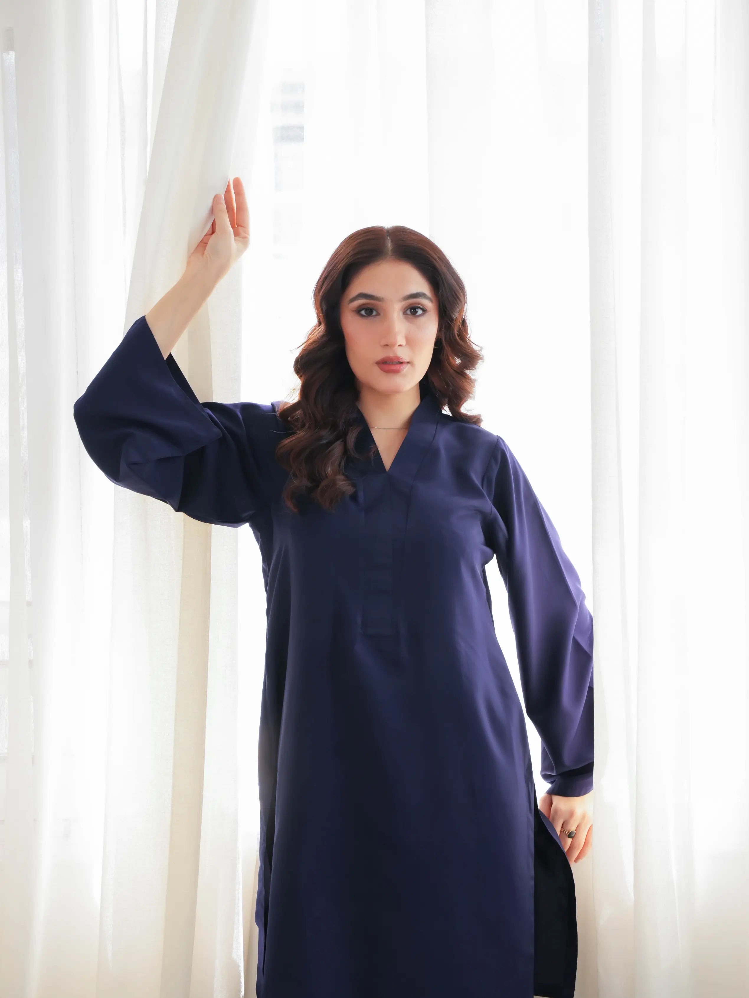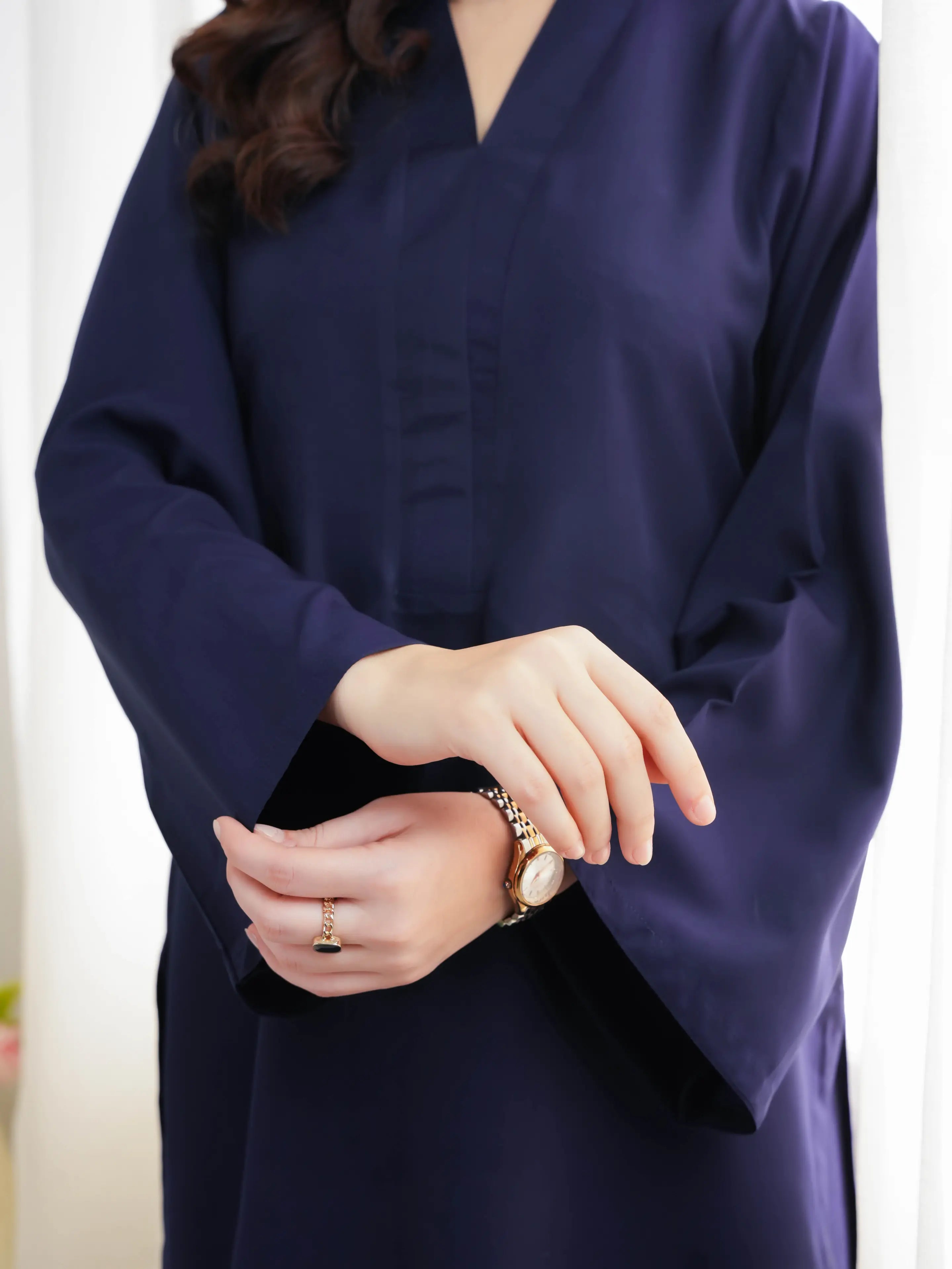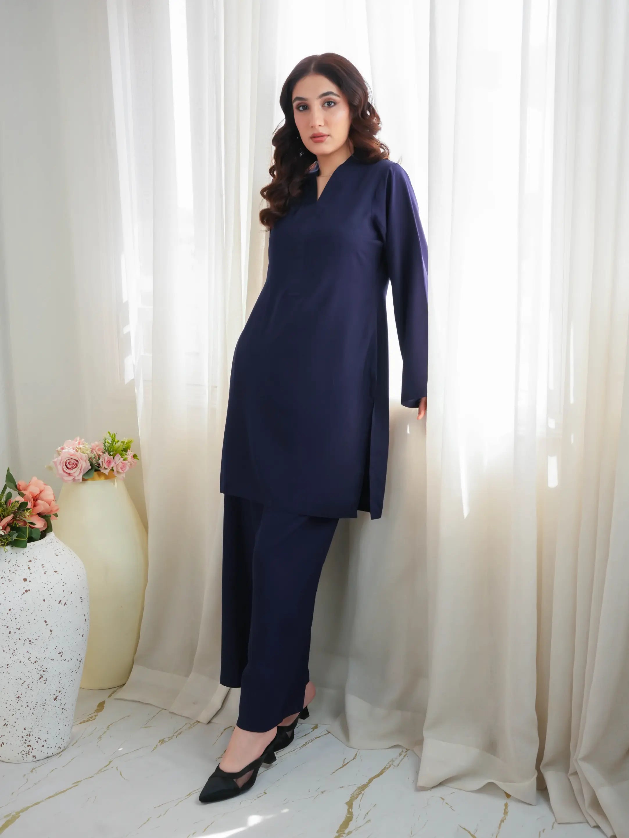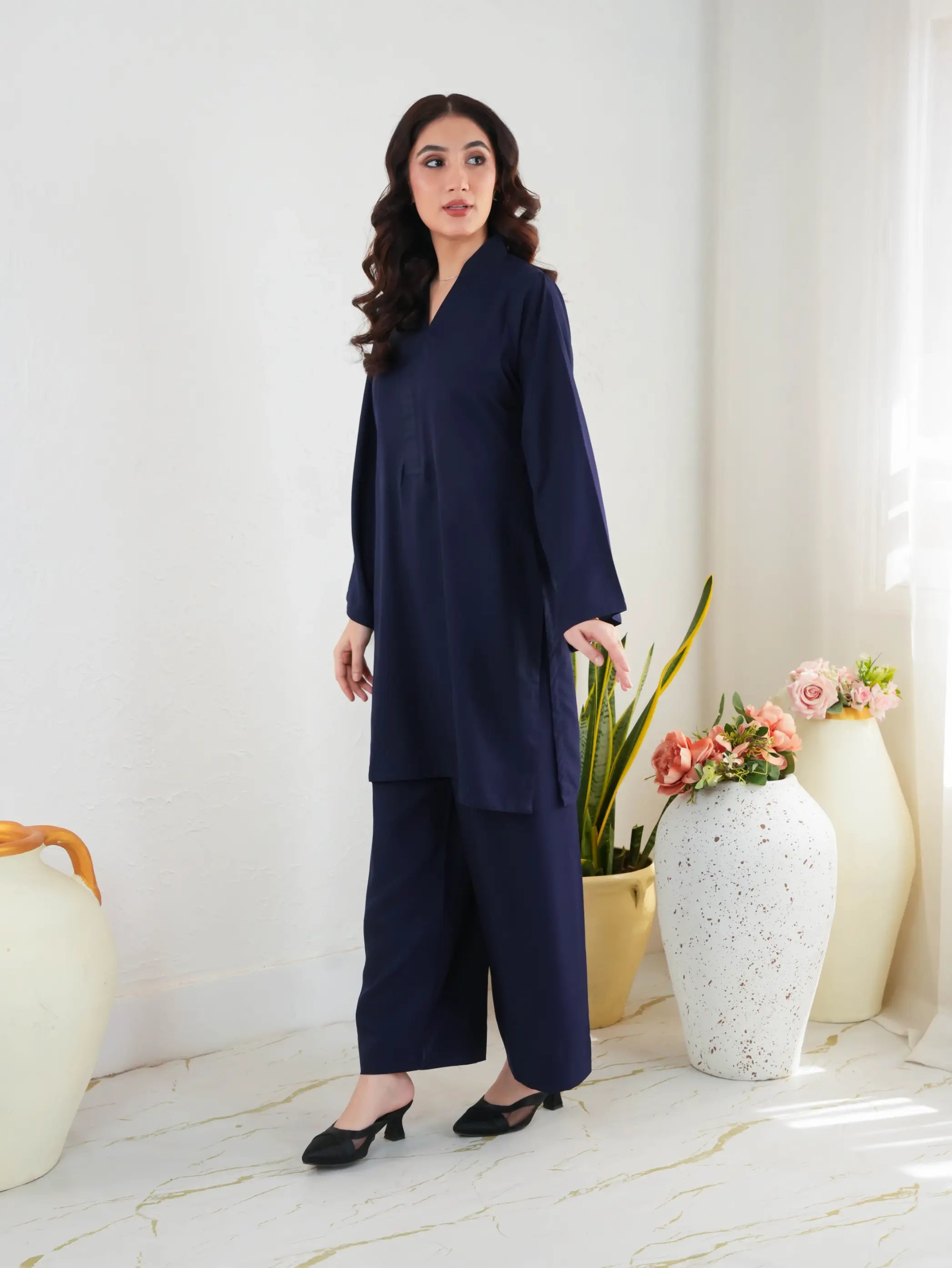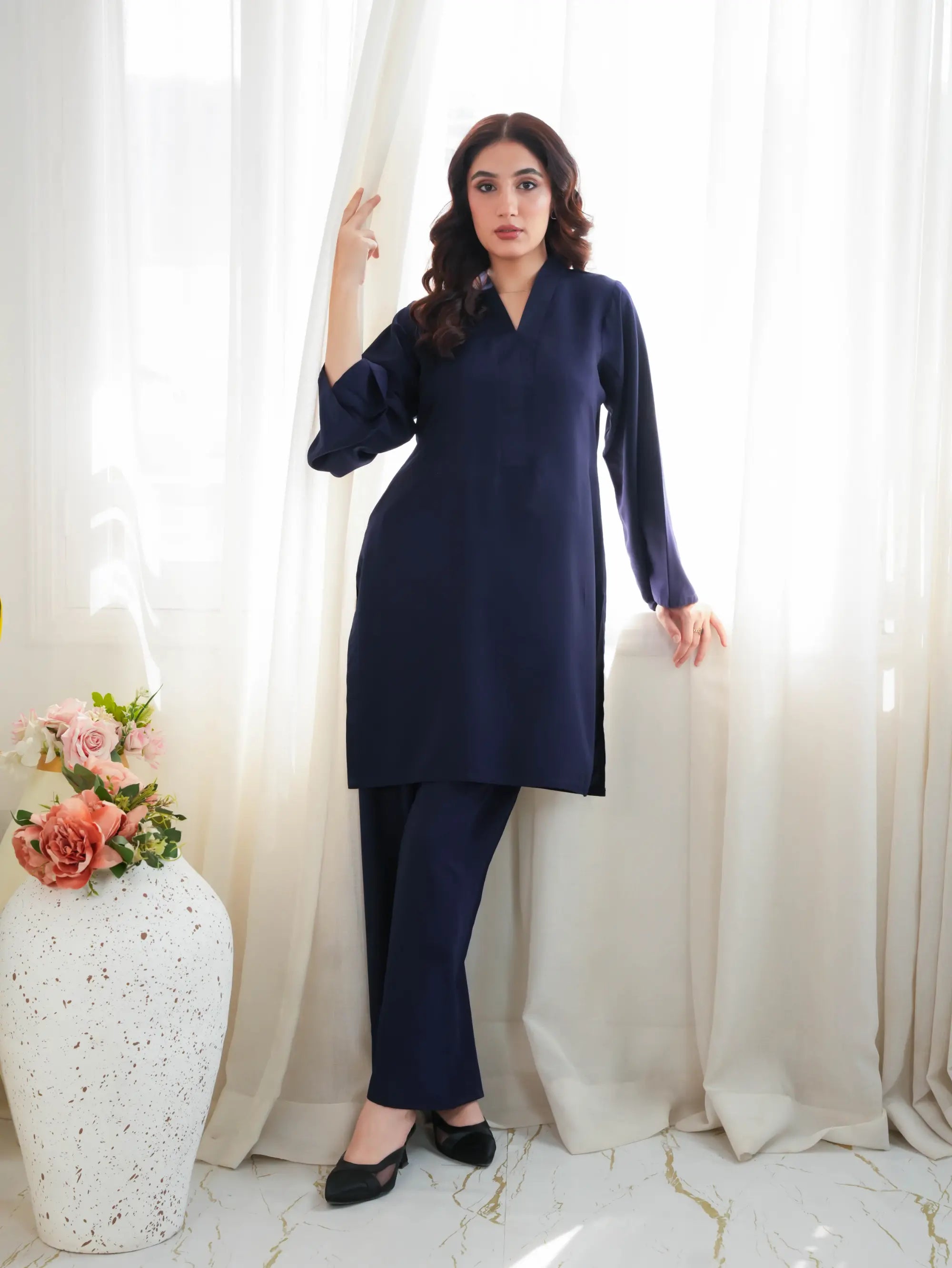 A must-have for effortless style. This simple, chic two-piece ensemble features a V-neck Crepe lawn shirt and matching fitted trousers in a stunning navy blue. The comfortable, monochromatic design is perfect for all-day sophistication.