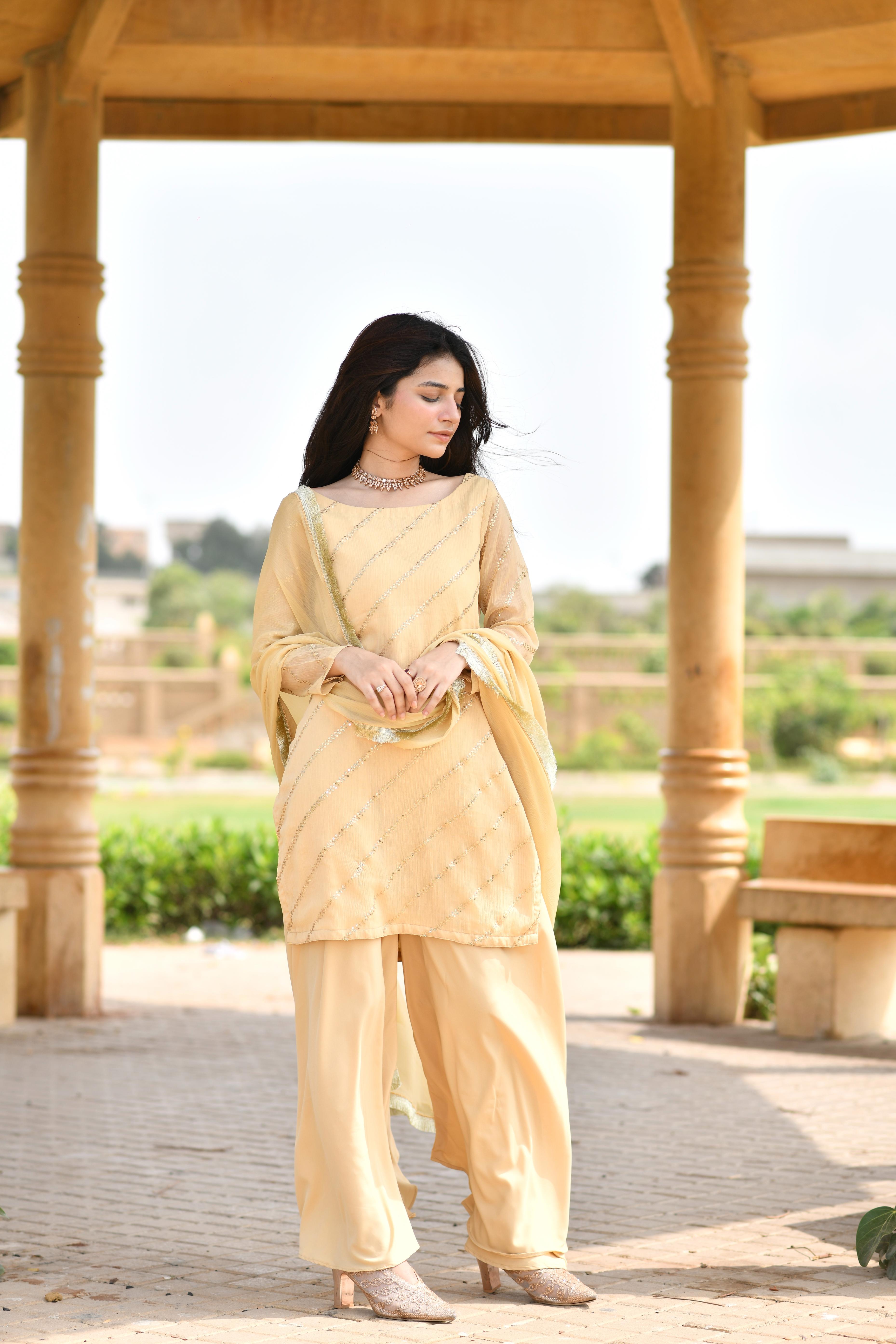 Experience elegance with this 3-piece ensemble, featuring a chiffon shirt adorned with delicate sitara (sequins) work that shimmers gracefully. Paired with flared chiffon palazzo pants for a breezy, flowy look, and completed with a matching chiffon dupatta.