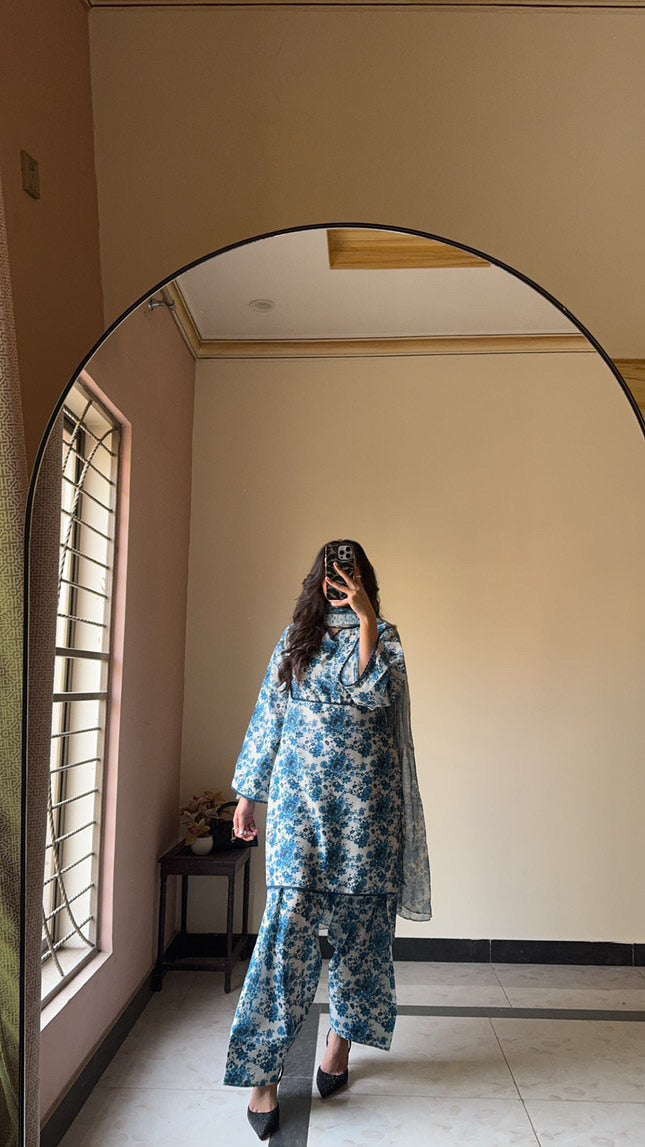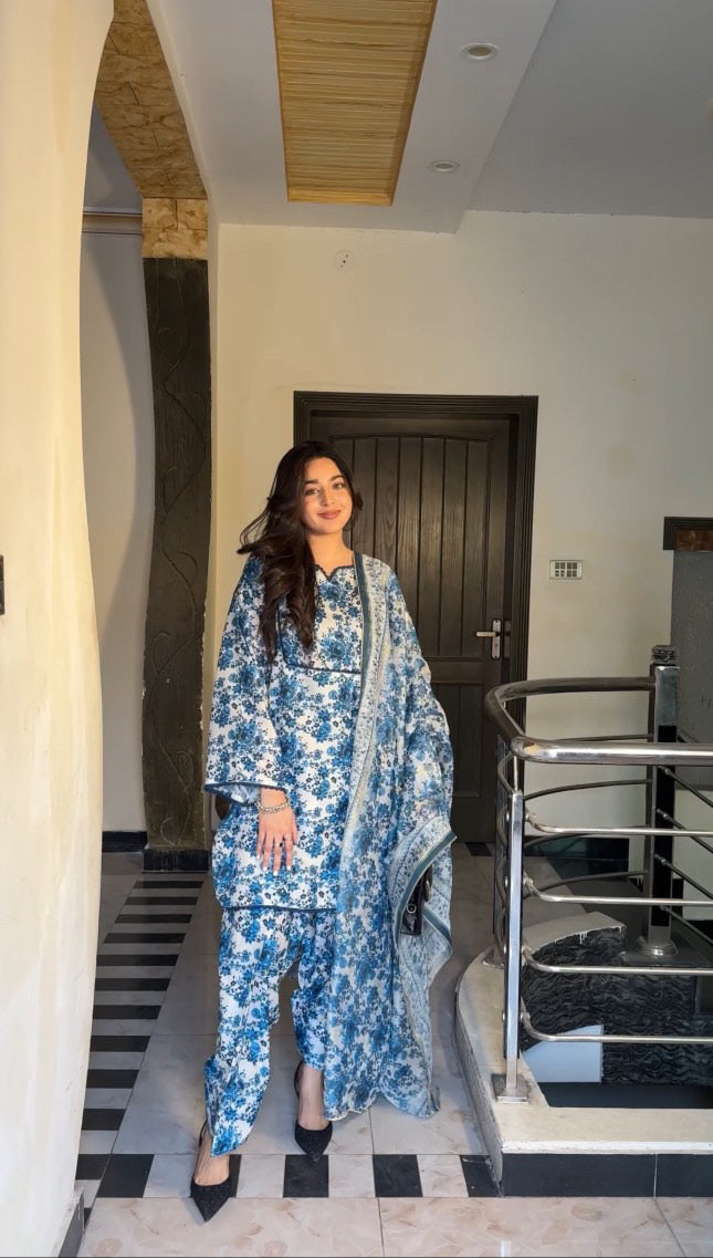 This sky blue printed set features a beautifully detailed shirt paired with a farshi shalwar. The shirt is adorned with intricate lace detailing, adding an elegant and refined touch to the overall design. The ensemble is completed with a monar dupatta, which adds a graceful flow to the outfit, enhancing its traditional appeal.