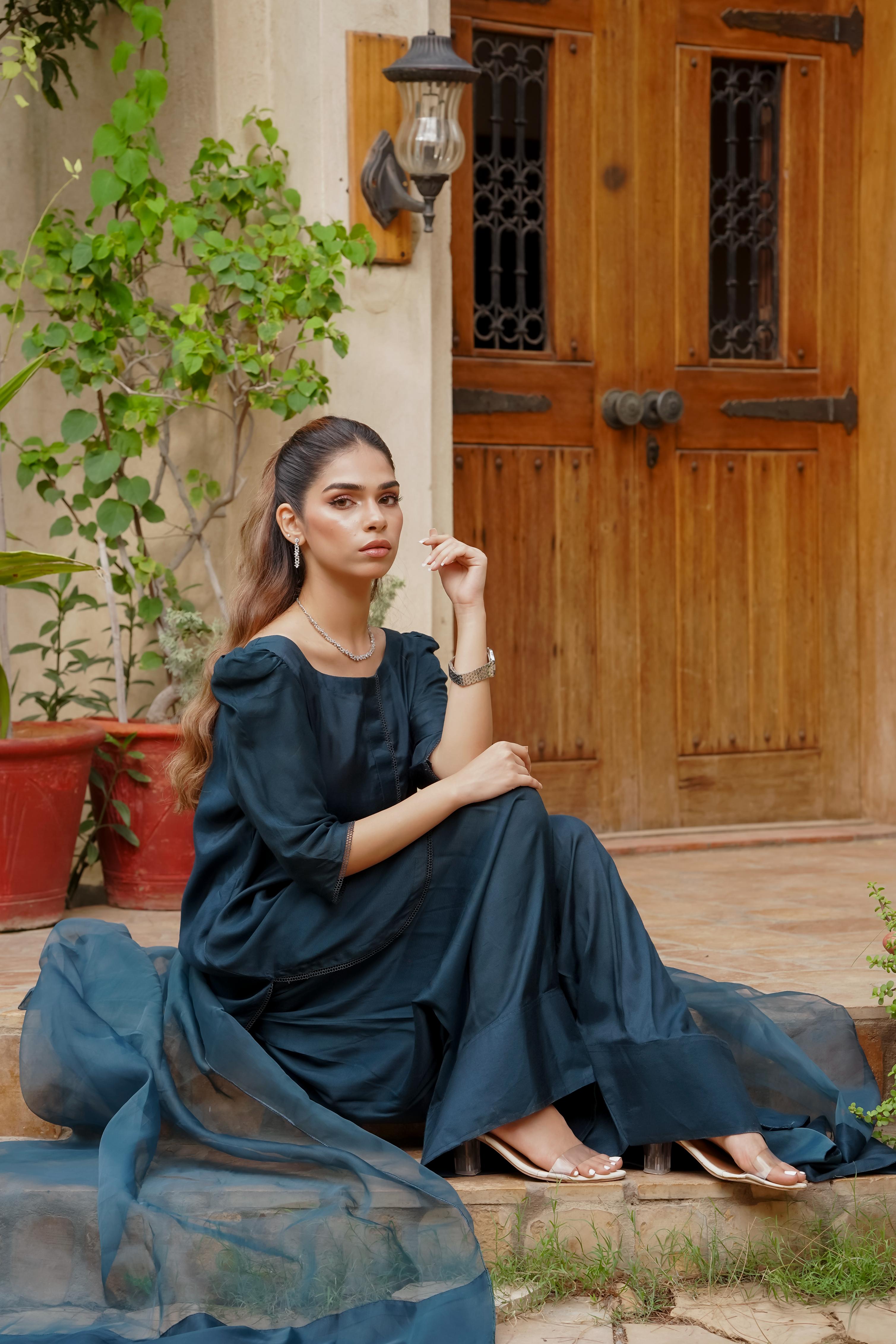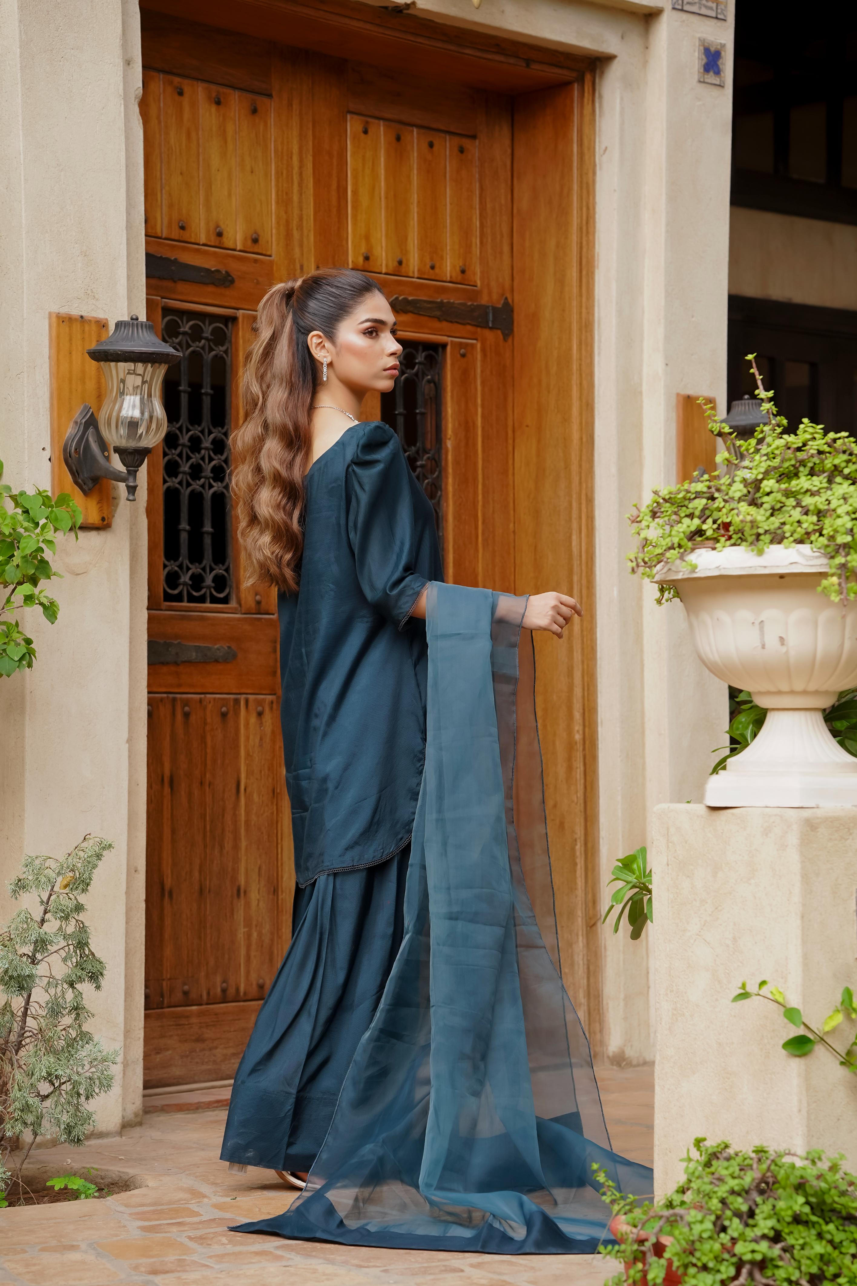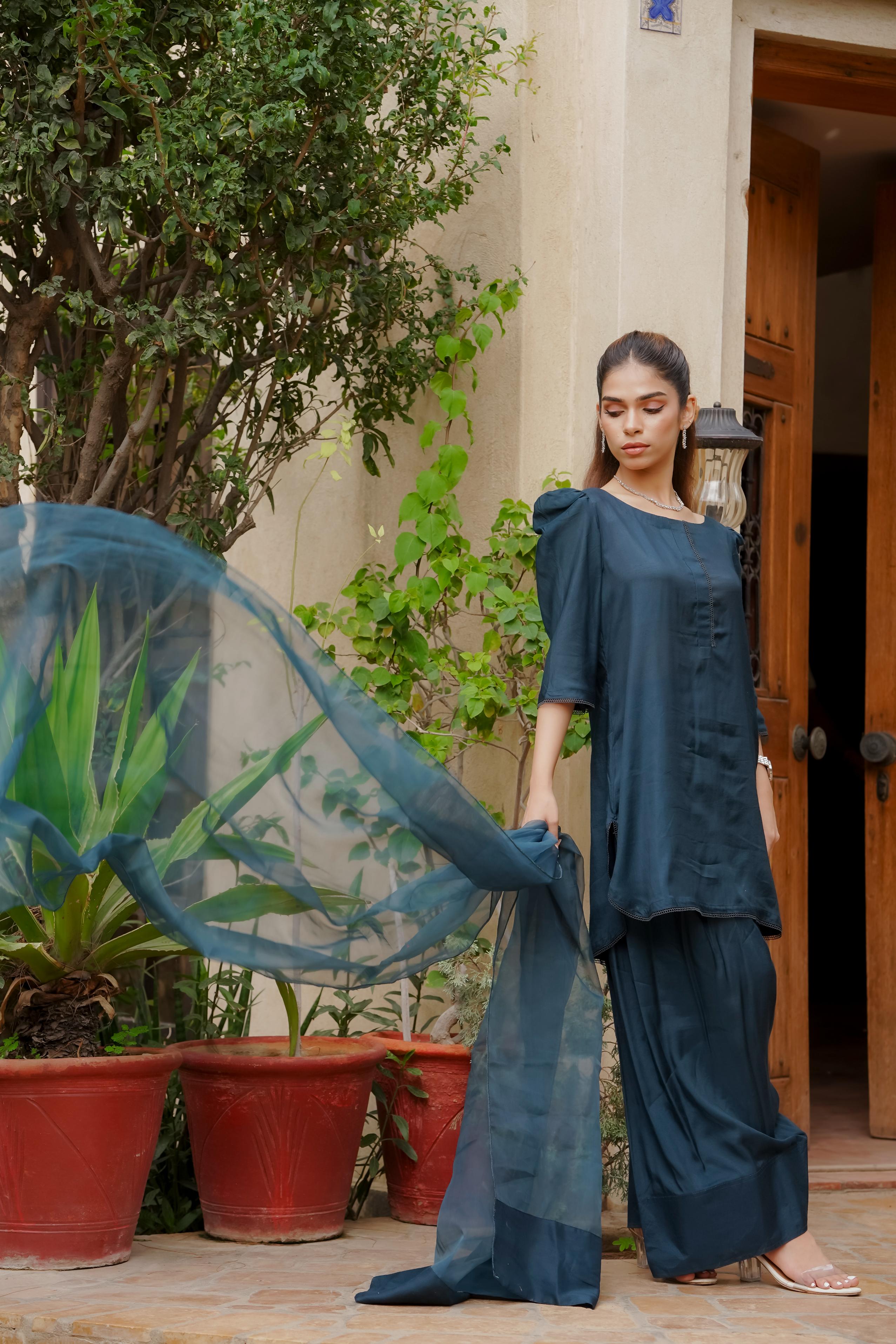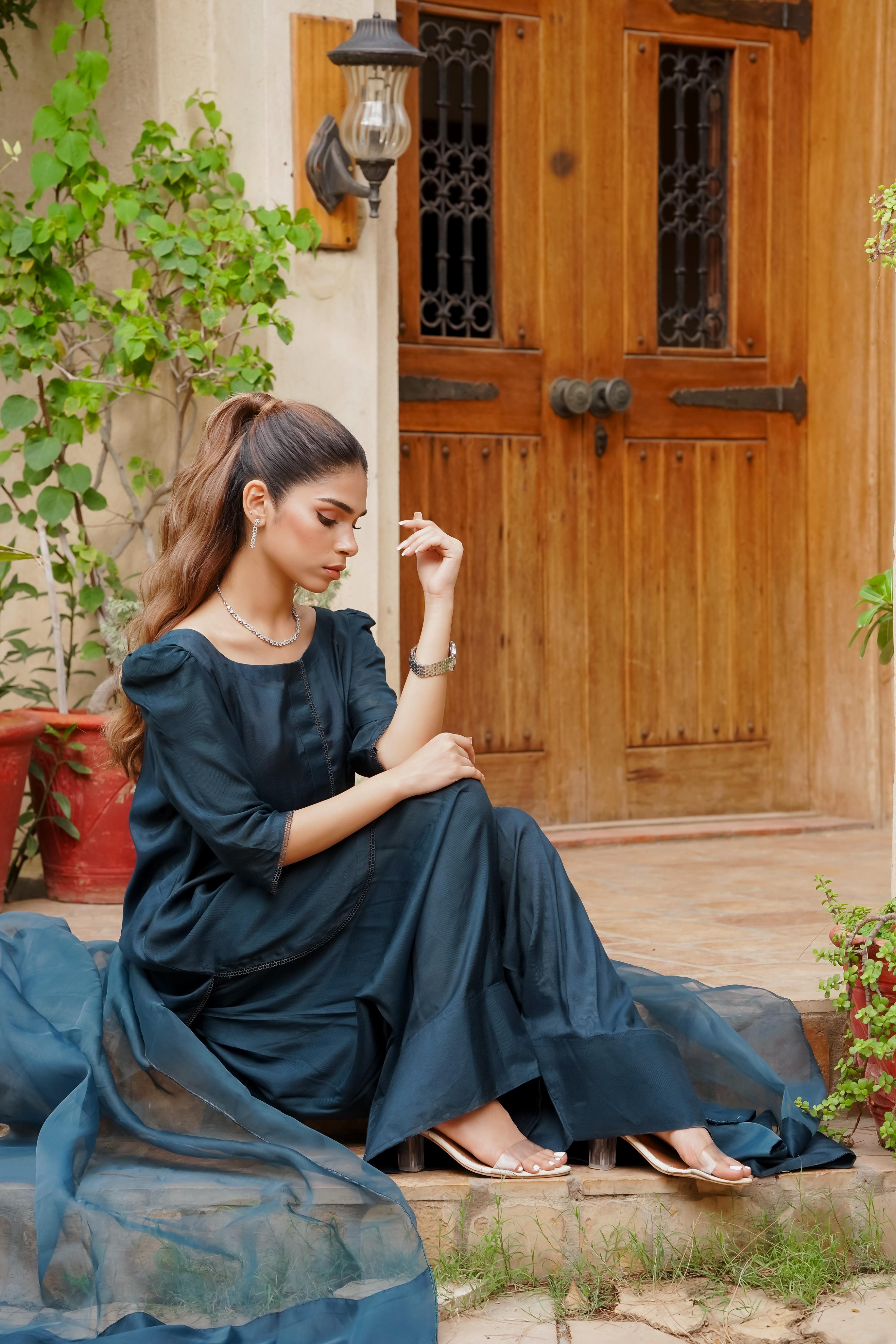 A chic cotton silk shirt with stylish puff sleeves, paired with a flowy wide-leg cotton silk shalwar. The look is completed with a delicate organza dupatta, adding a touch of sophistication to the overall ensemble