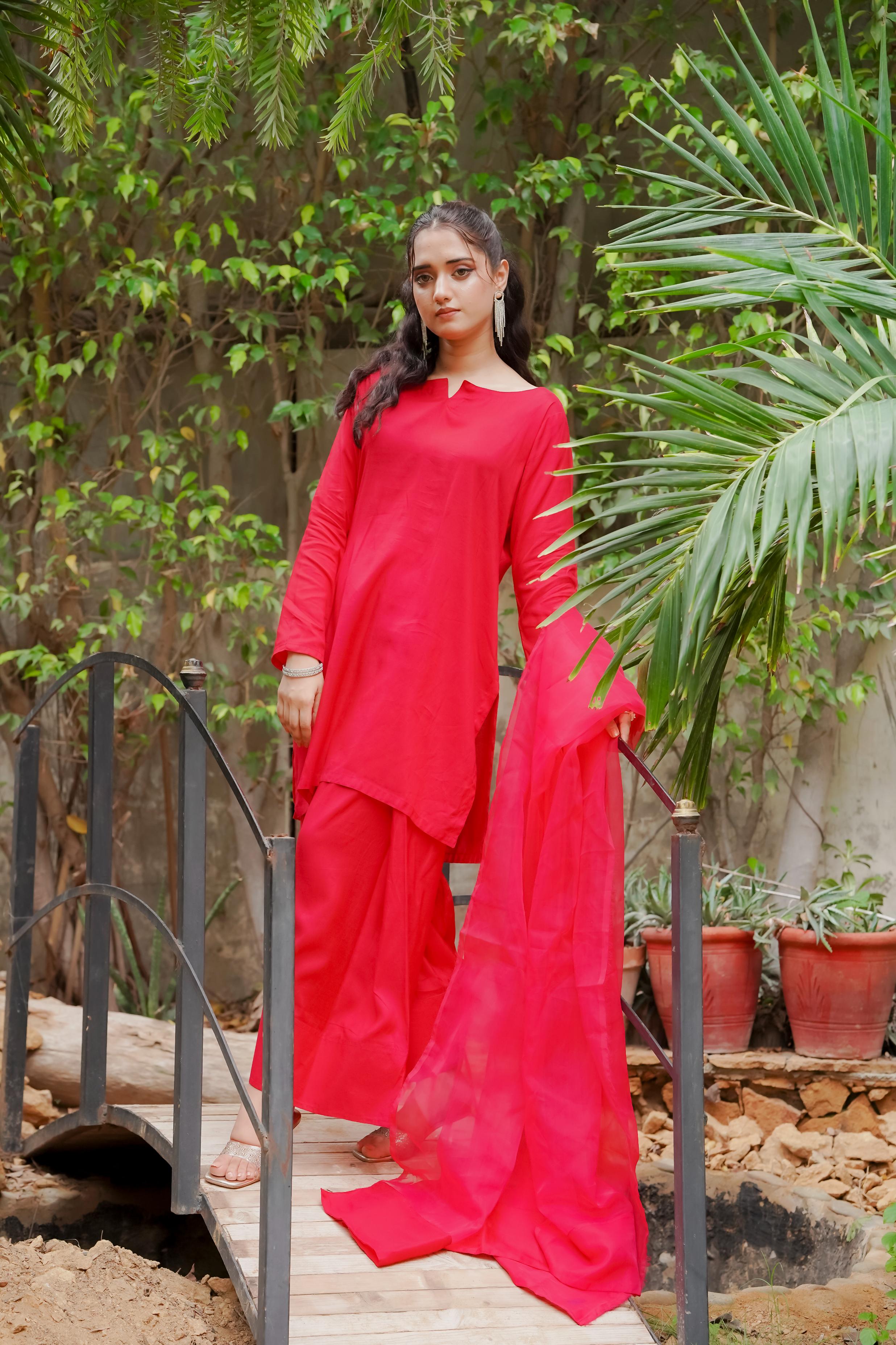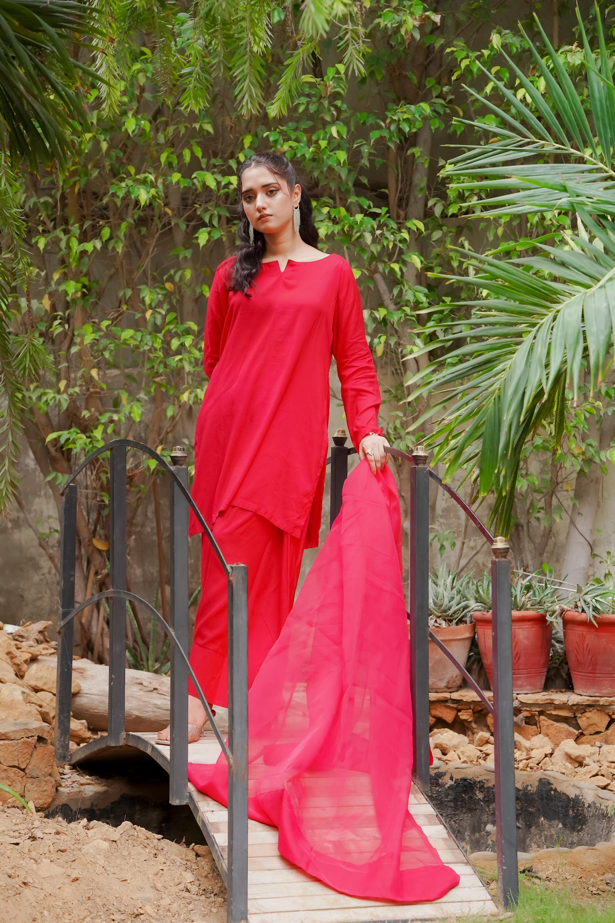 Elevate your wardrobe with this elegant 3-piece set featuring a soft cotton silk shirt, perfectly complemented by a comfortable loose-fit cotton silk trouser. The look is completed with a lightweight, sheer organza dupatta for a touch of sophistication.