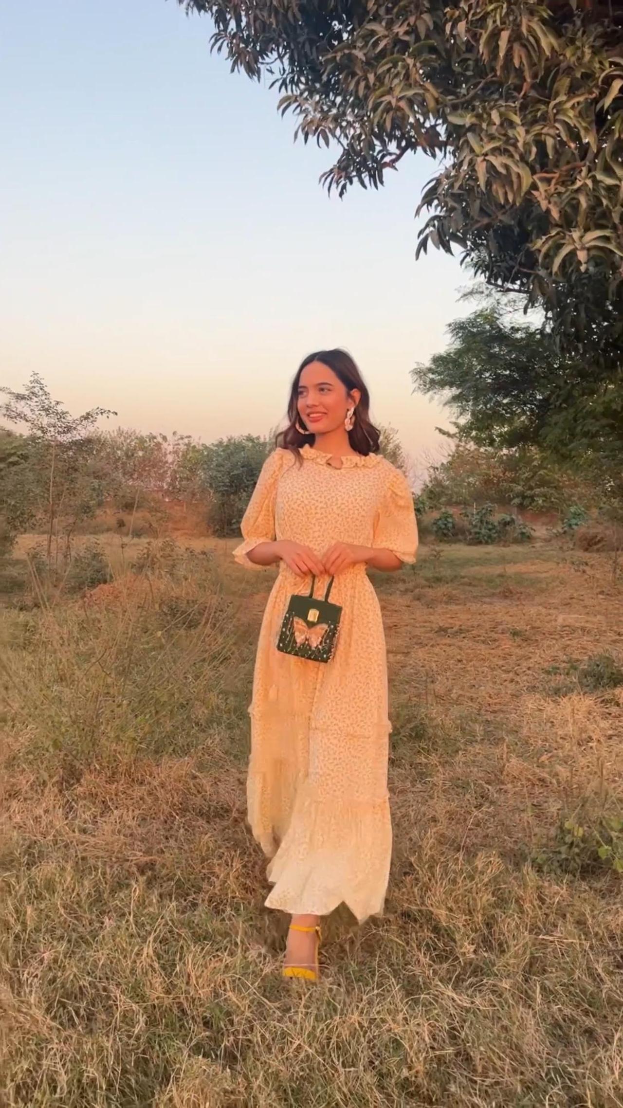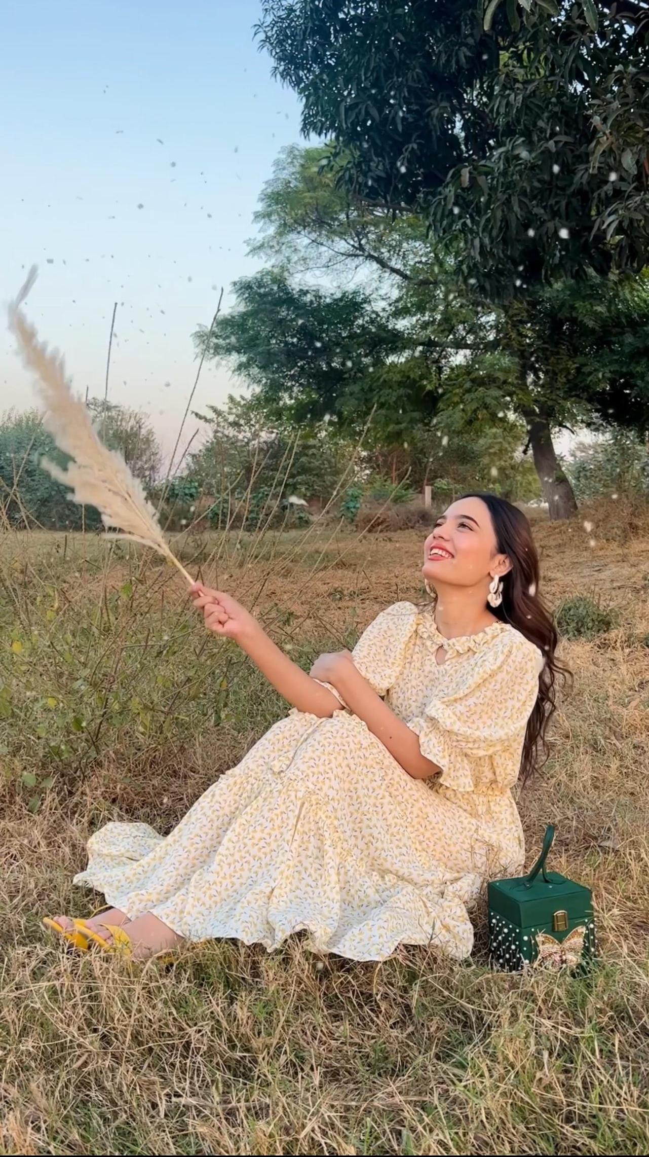 This lovely dress features a delicate floral print with a soft, pastel hue, adding a touch of romantic elegance. Designed with a flattering cinched waist, ruffled collar, and puff sleeves, it exudes a graceful, feminine appeal. The flowy, tiered skirt creates a beautiful silhouette, perfect for casual outings or daytime events. Style it with your favorite accessories for a chic, polished look that feels both comfortable and stylish.
