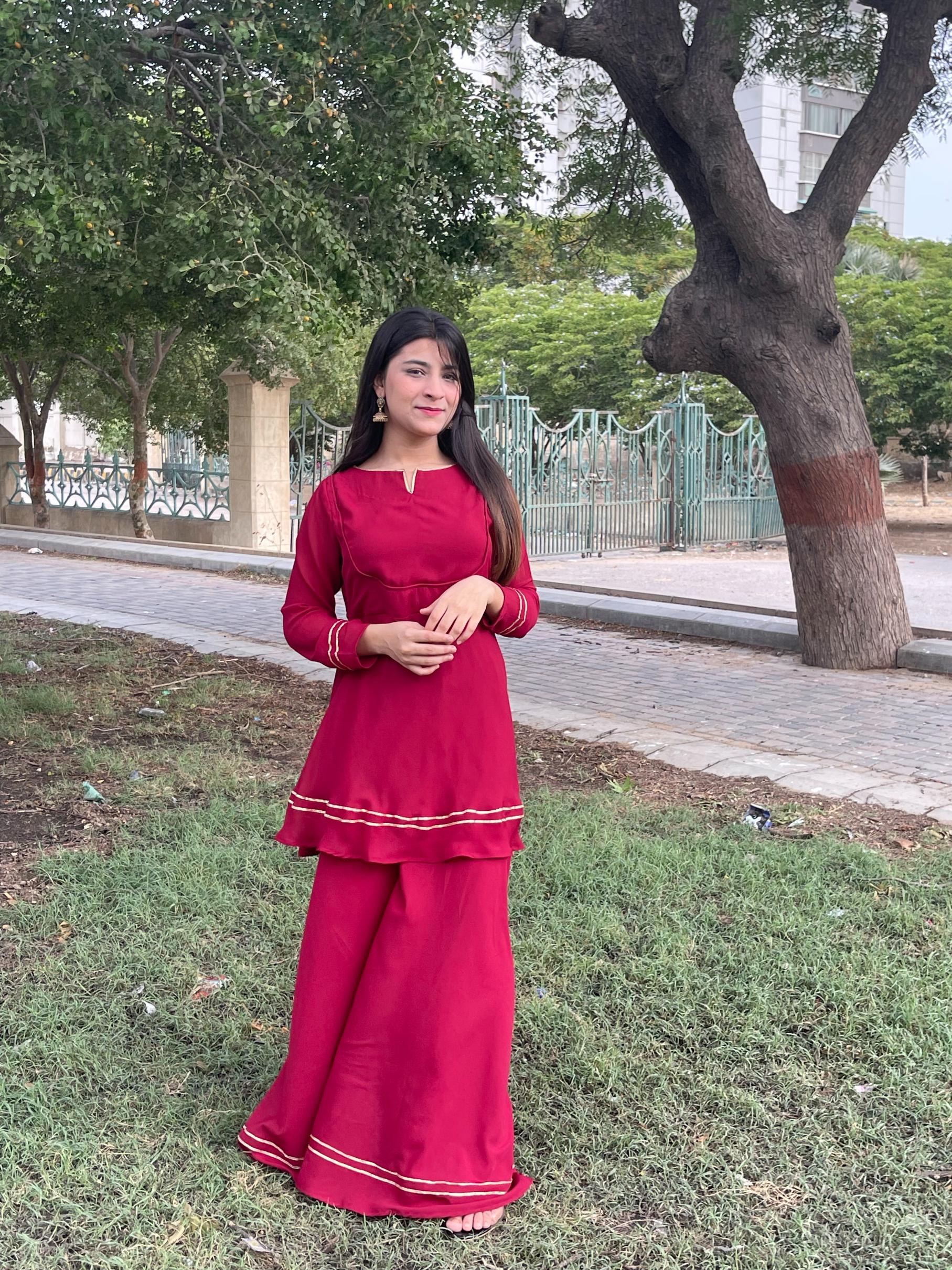 This ensemble features a graceful malayi crepe frock, paired with flared malayi crepe palazzo pants for a breezy, sophisticated look.