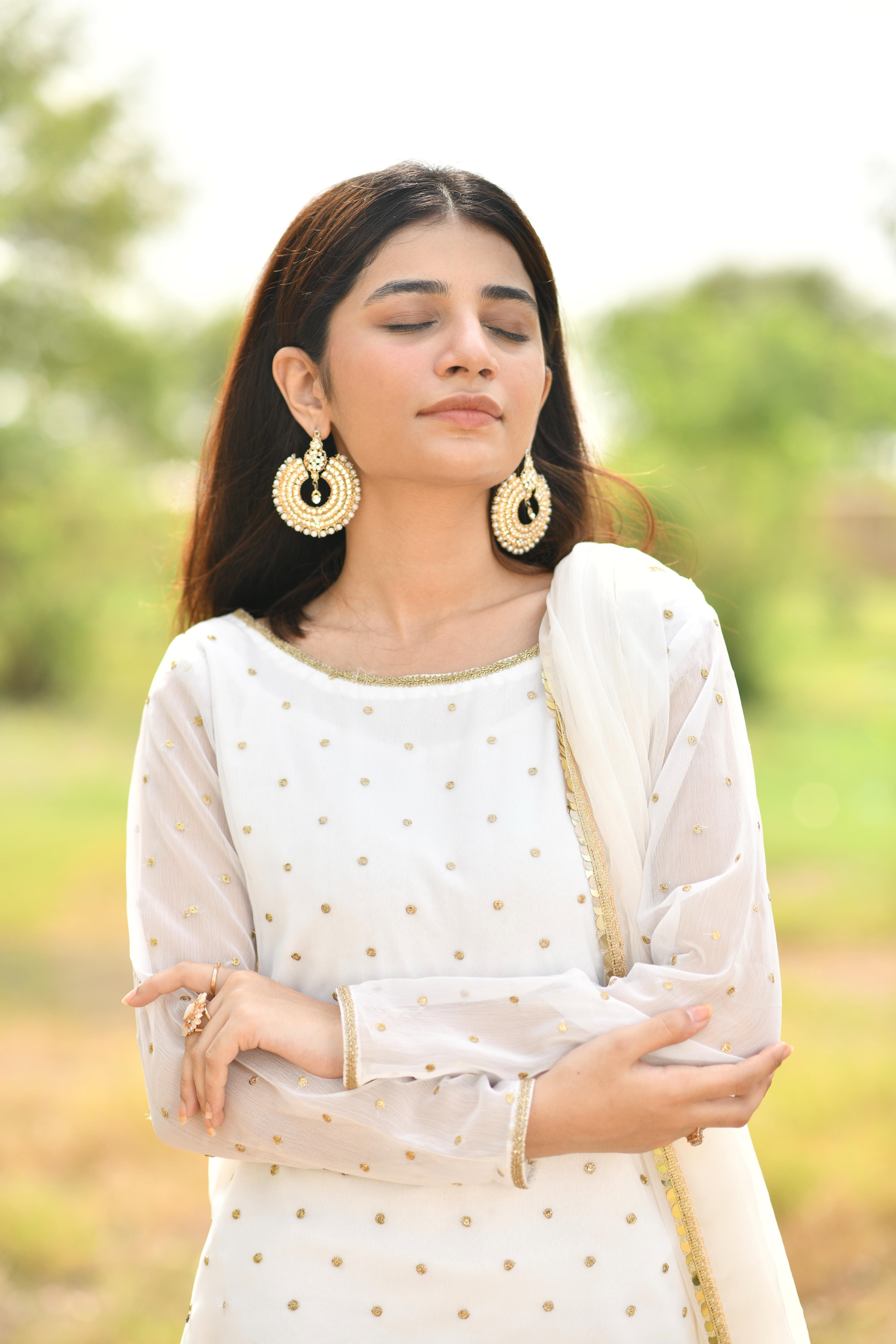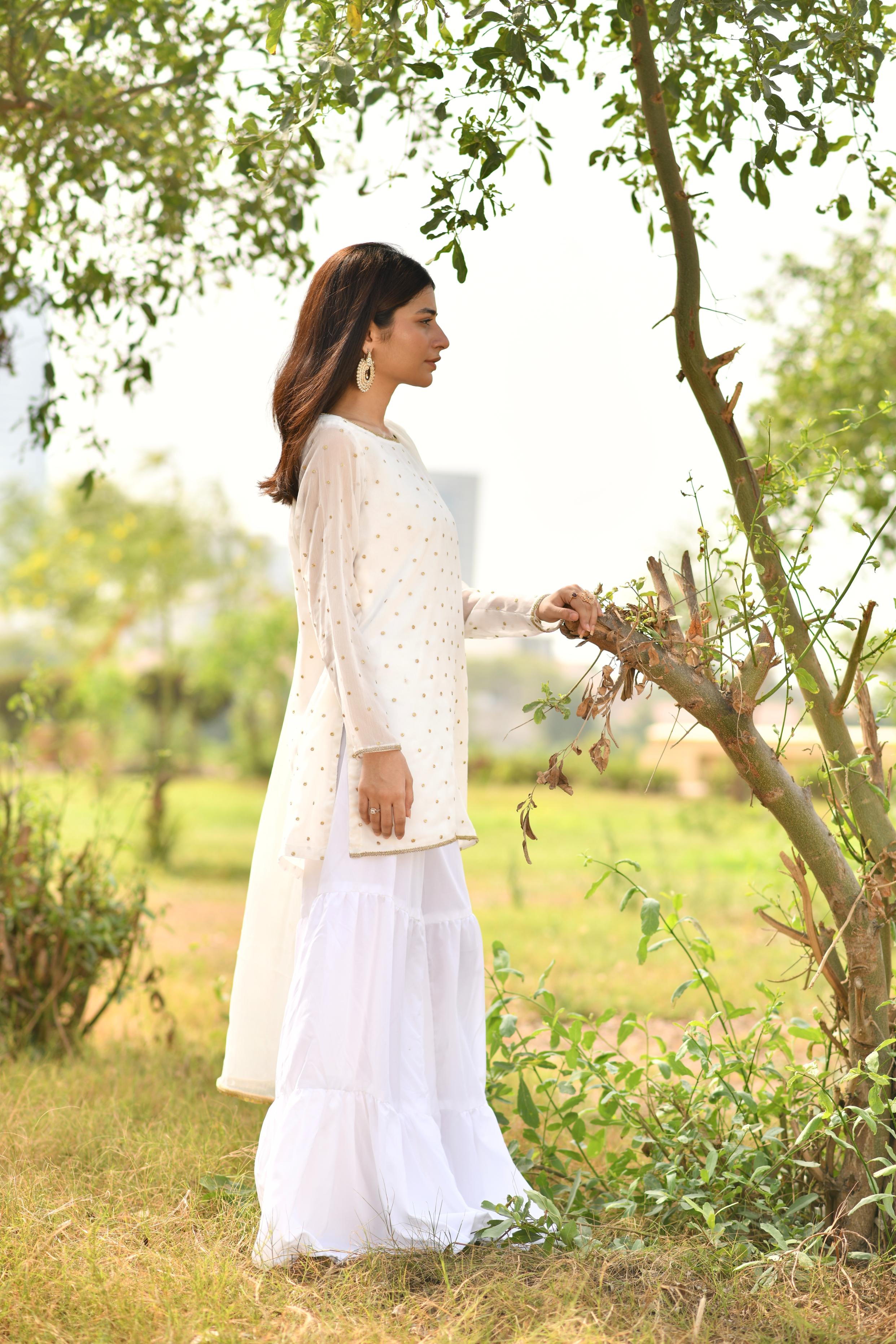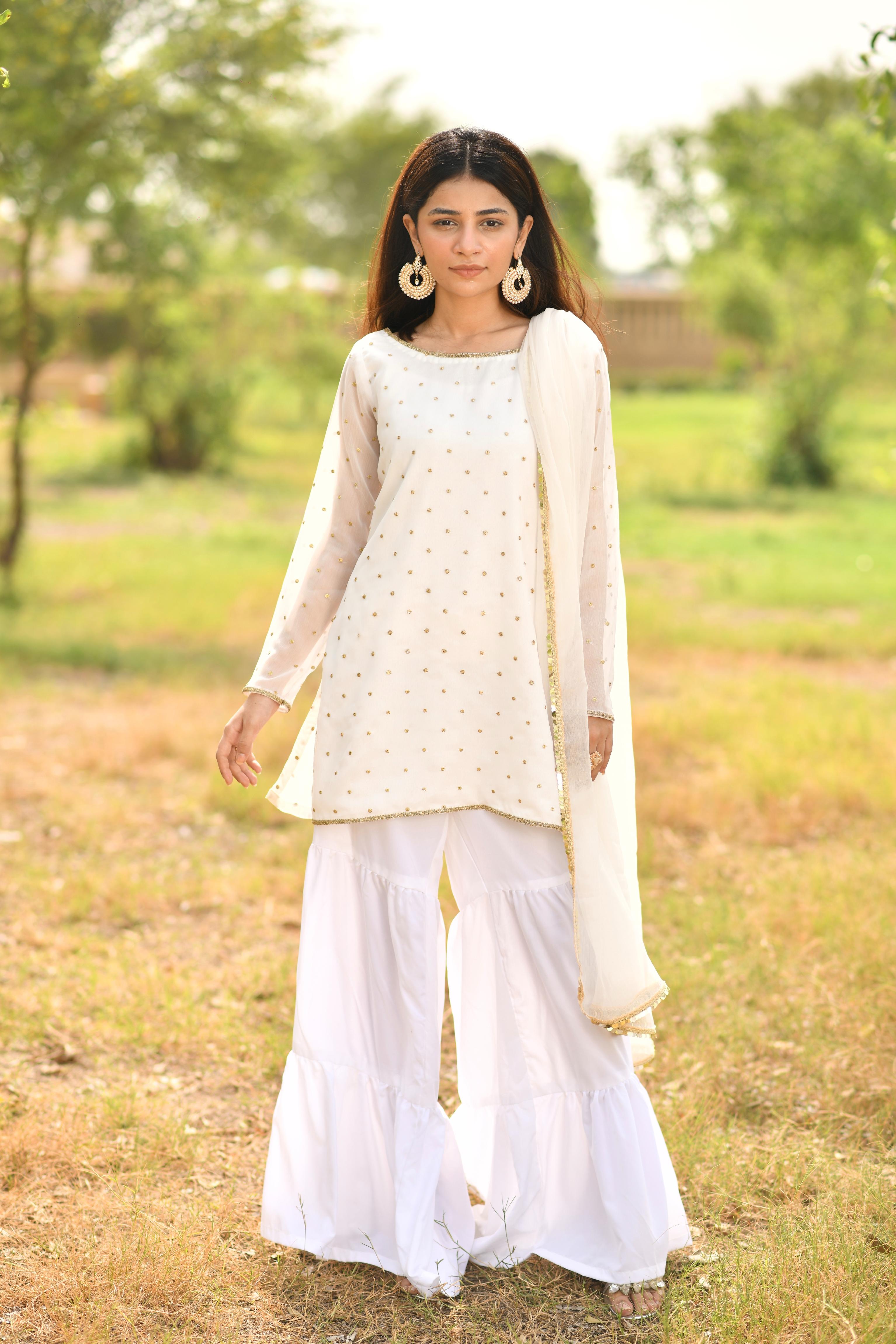 This exquisite set features a chiffon shirt adorned with delicate zari and lace detailing, adding a touch of sophistication. Paired with flowy crepe gharara pants and a matching chiffon dupatta edged with lace on all four sides, this outfit is perfect for any special occasion.