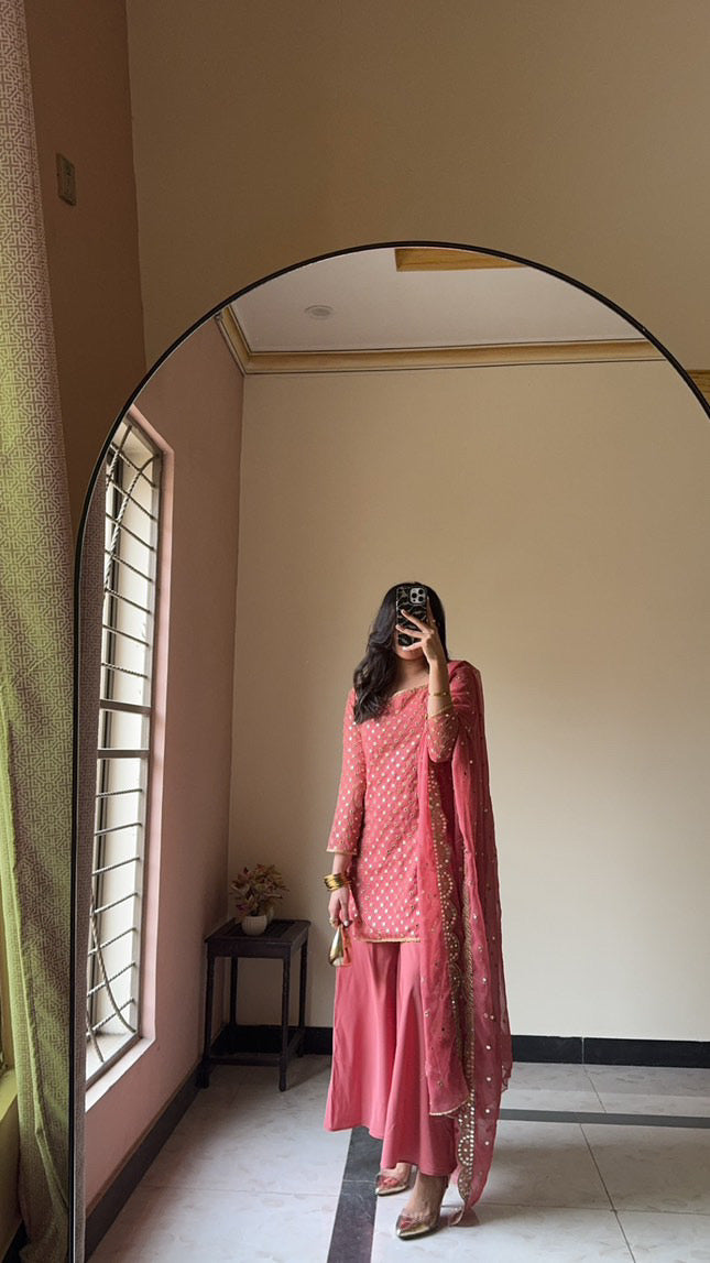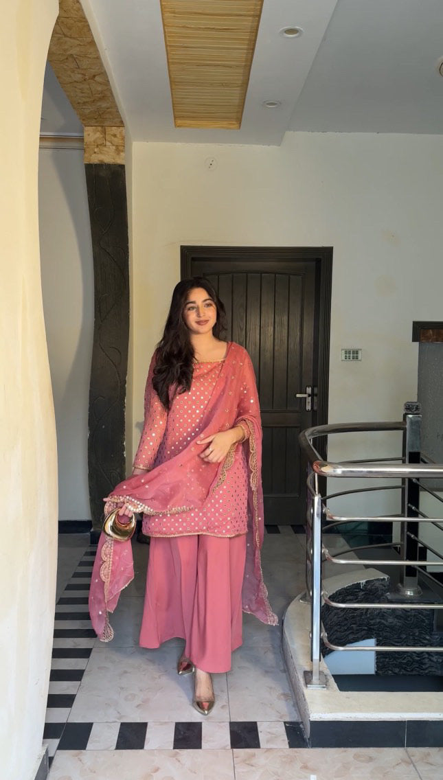 This elegant tea pink set is designed with delicate golden lace detailing, adding a touch of sophistication. The set includes a flared plazzo, offering comfort and style with its relaxed fit. Complementing the outfit is an embroidered dupatta, featuring intricate designs that enhance its beauty.